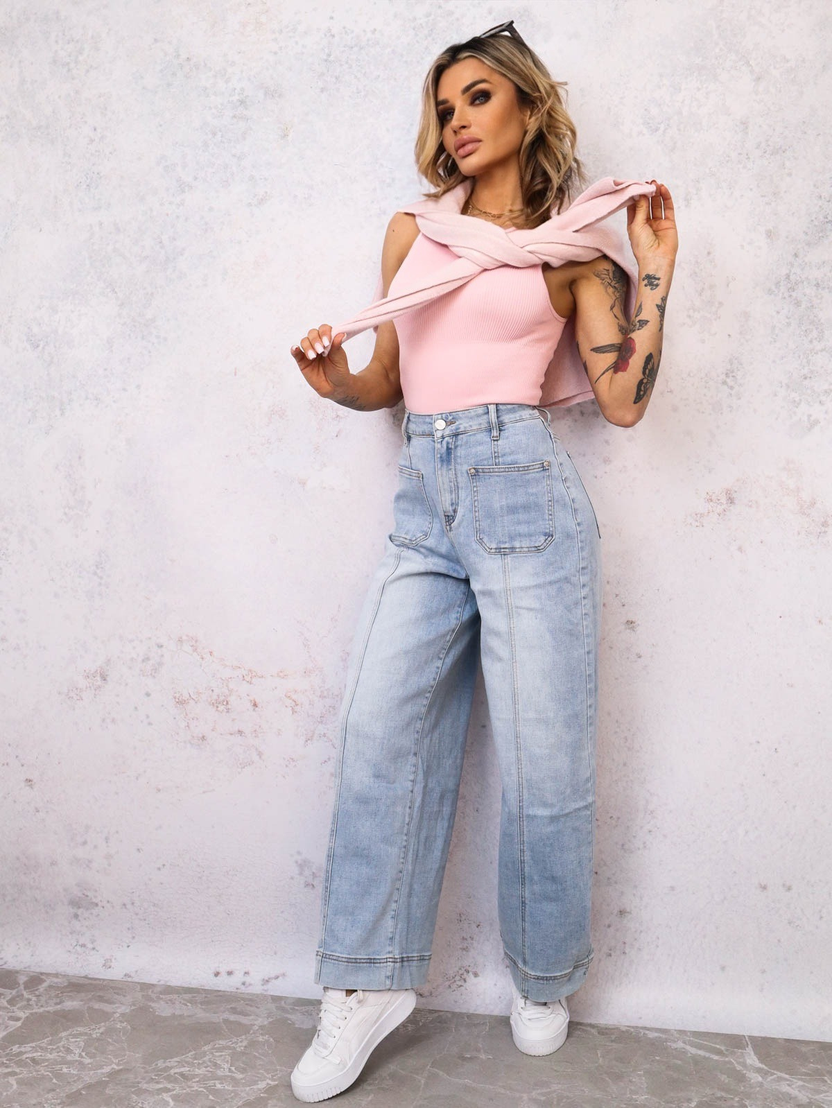 SPODNIE JEANSOWE Z OZDOBNYMI PRZESZYCIAMI I KIESZENIAMI Z PRZODU