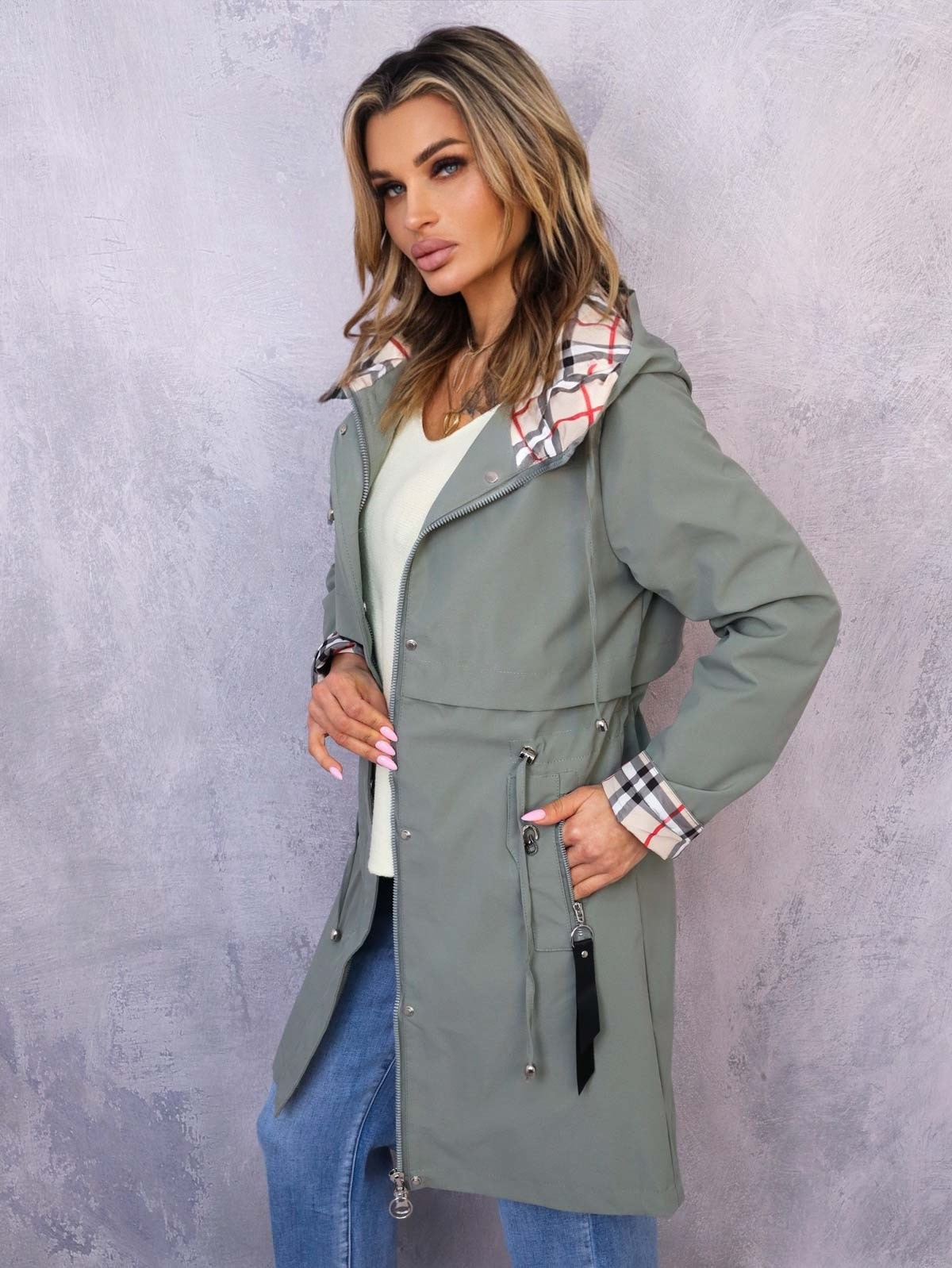 Kurtka parka z kapturem w kratę. Wiązanie w pasie, zapinany na zamek i zatrzaski. Ozdobne taśmy przy kieszeniach.