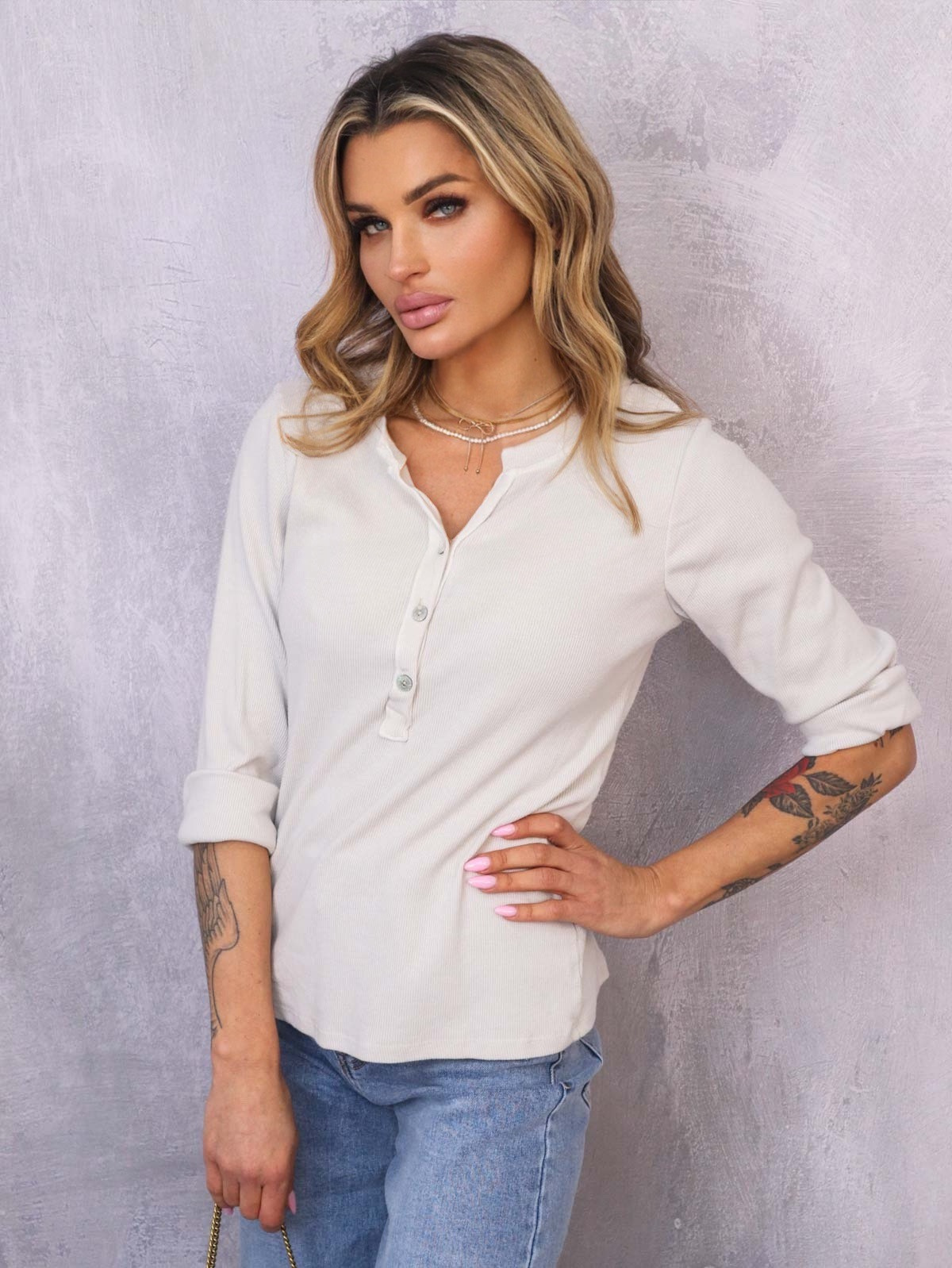 Bluzka z dekoltem zapinanym na guziki. Podwijane rękawy.