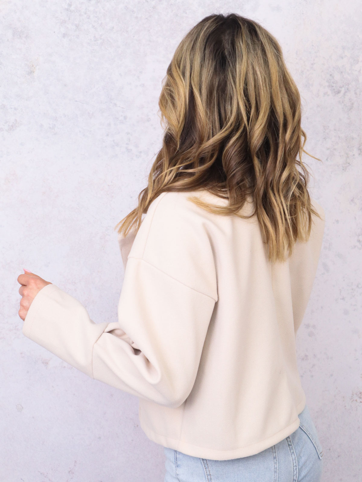 KRÓTKI PŁASZCZ Z KOŁNIERZEM I OZDOBNĄ BROSZKĄ- JASNOBEŻOWY