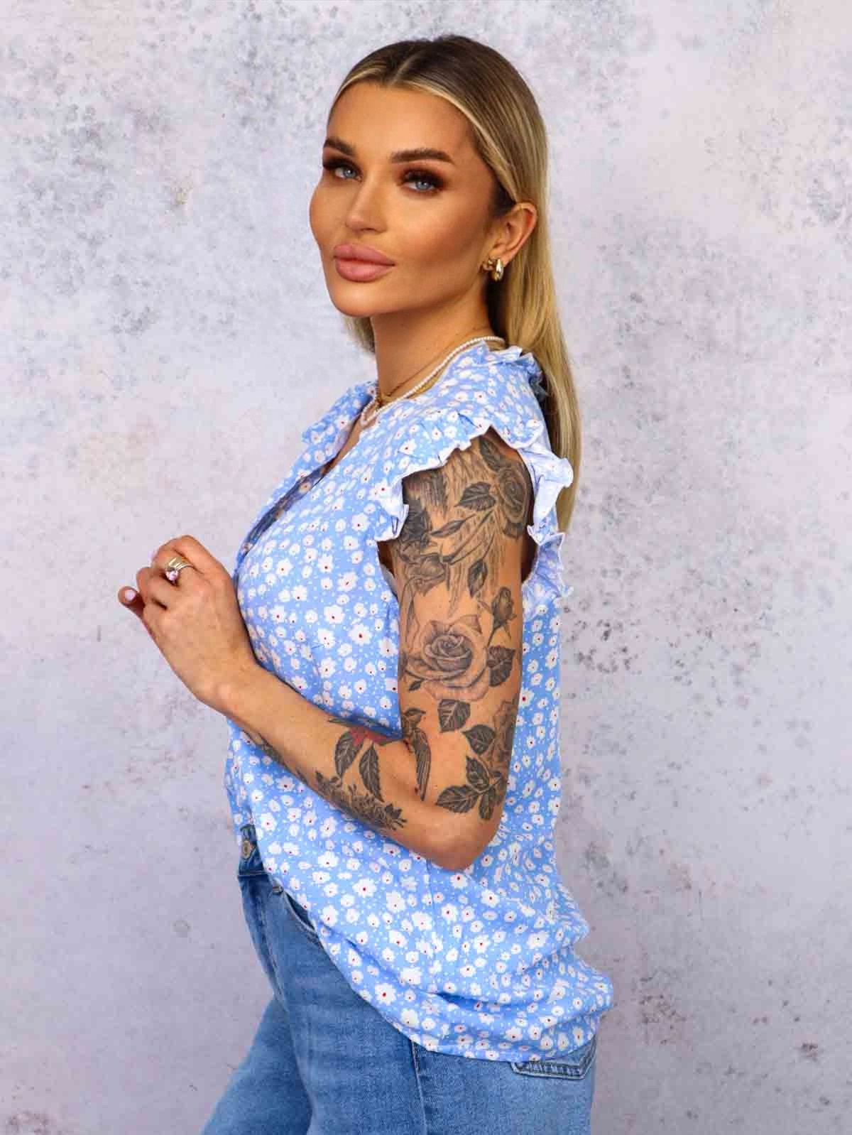 BLUZKA W KWIECISTY WZÓR Z FALBANKAMI- NIEBIESKA