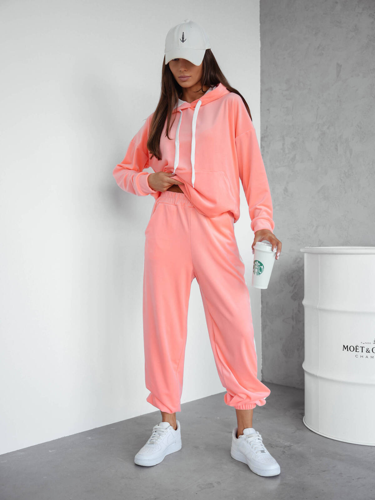 Komplet dresowy, welurowy, dwuczęściowy. Bluza z kontrastowym kapturem i sznurkami. Z przodu kieszeń kangurka. Rękawy i bluza zakończone ściągaczem. Spodnie z gumą w pasie zakończone ściągaczem. Posiadają kontrastowe lampasy po bokach.