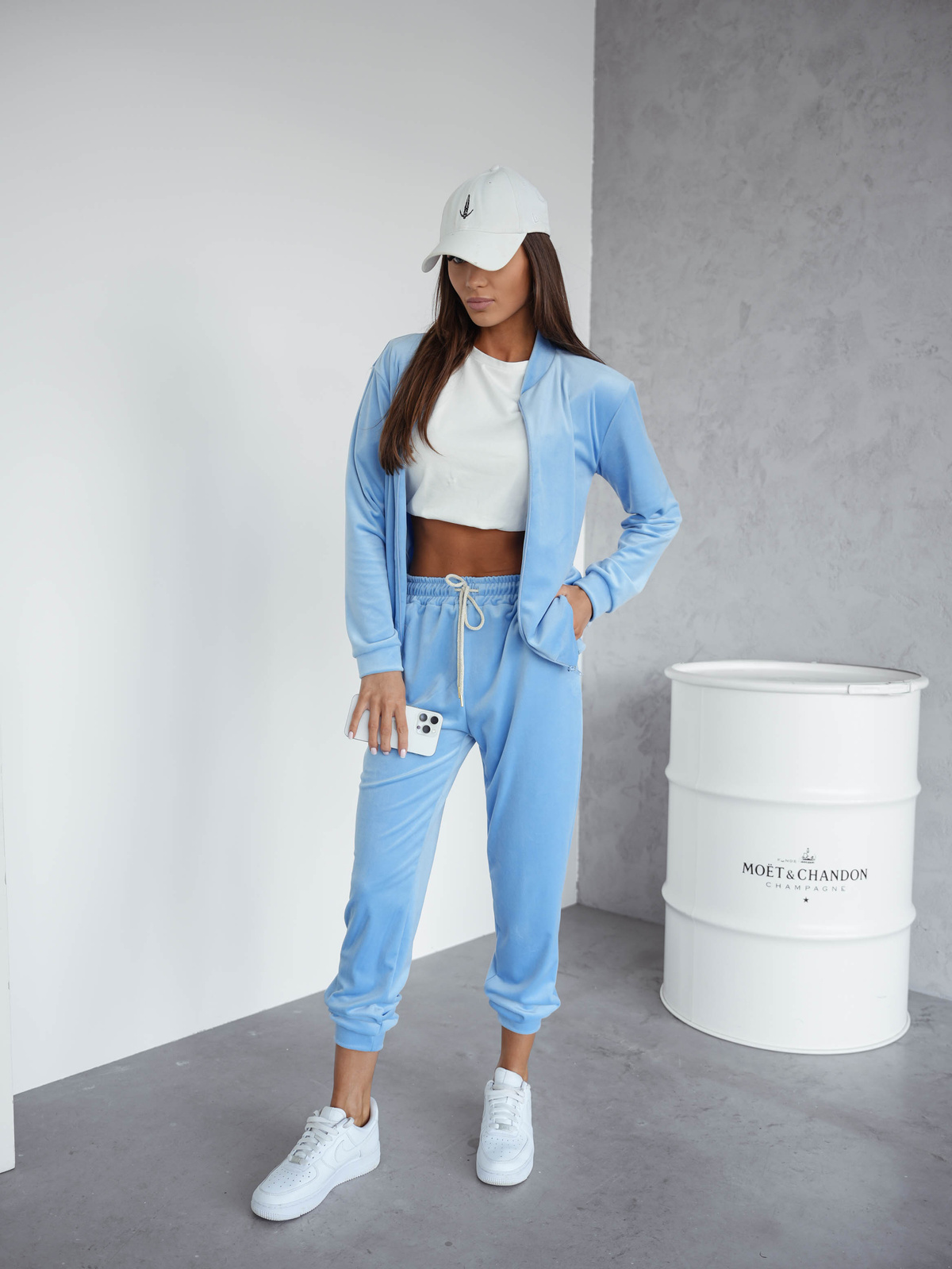 Komplet dresowy, welurowy, dwuczęściowy. Bluza zapinana na zamek, posiada ściągacz na dole i na rękawach. Spodnie z gumą i wiązaniem w pasie, kieszenie po bokach, ściągacze na dole nogawek.