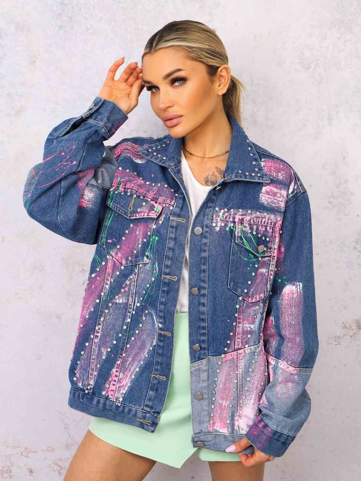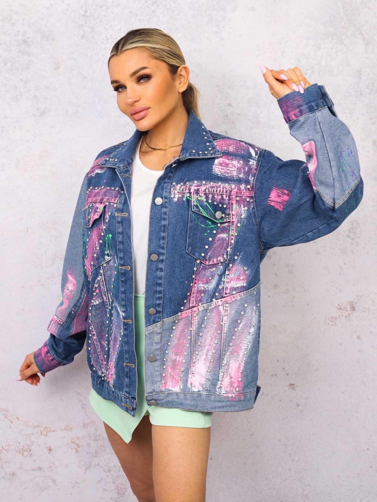 Kurtka jeansowa w kolorowe wzory. Ozdobiona kryształkami. Oversizowy krój, wykonana z najwyższej jakości materiału.