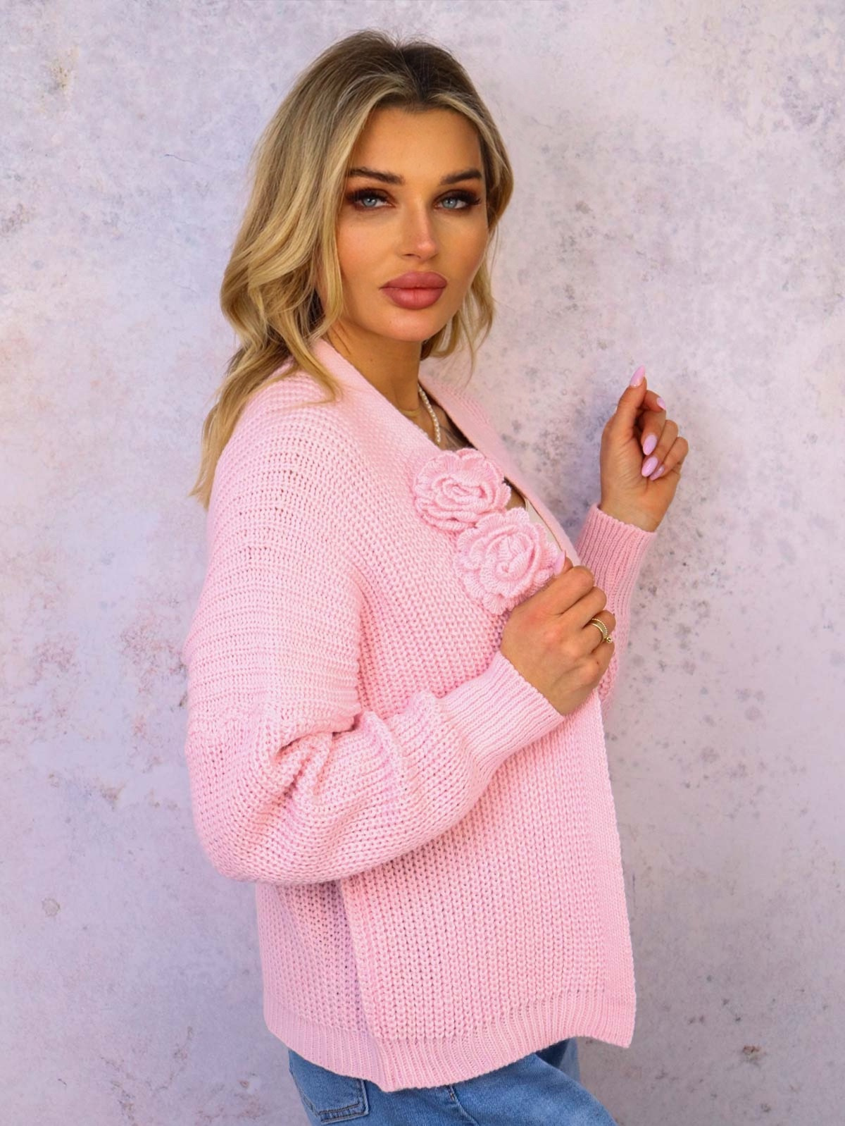 KRÓTKI KARDIGAN Z PRZYPINANYMI KWIATAMI- JASNORÓŻÓWY