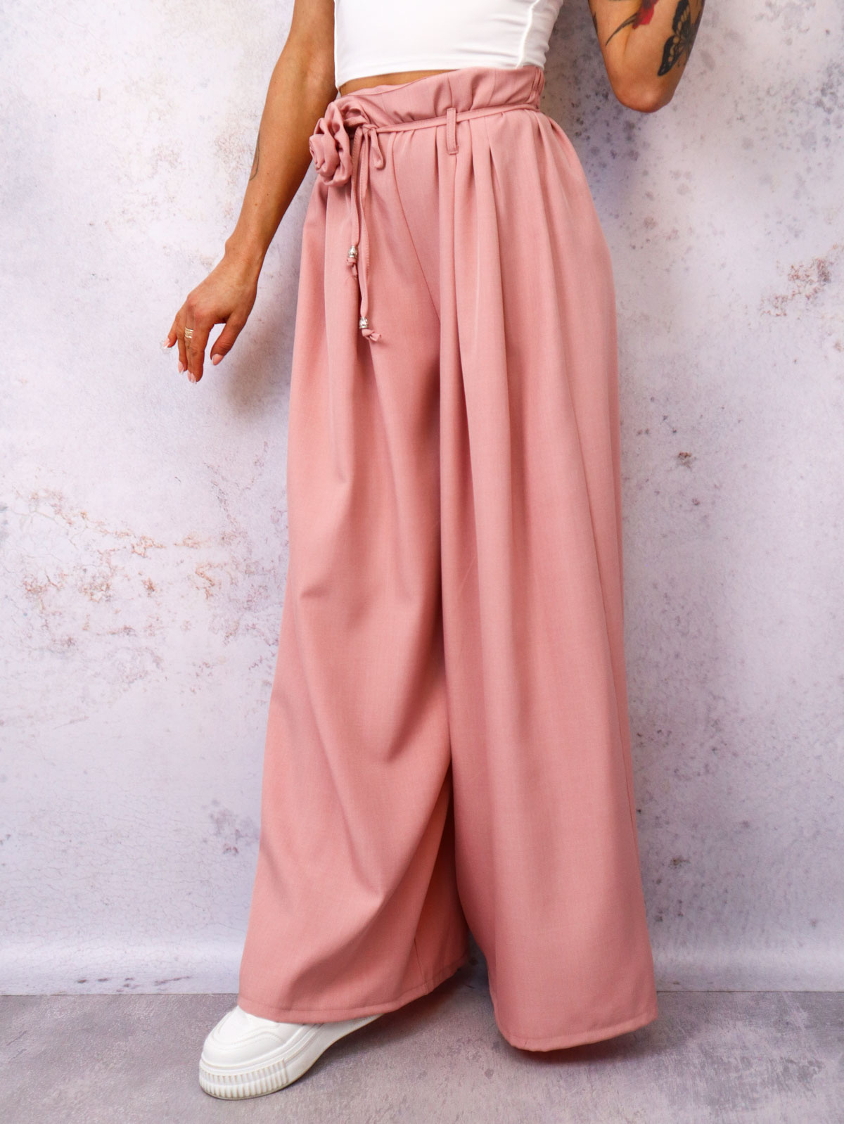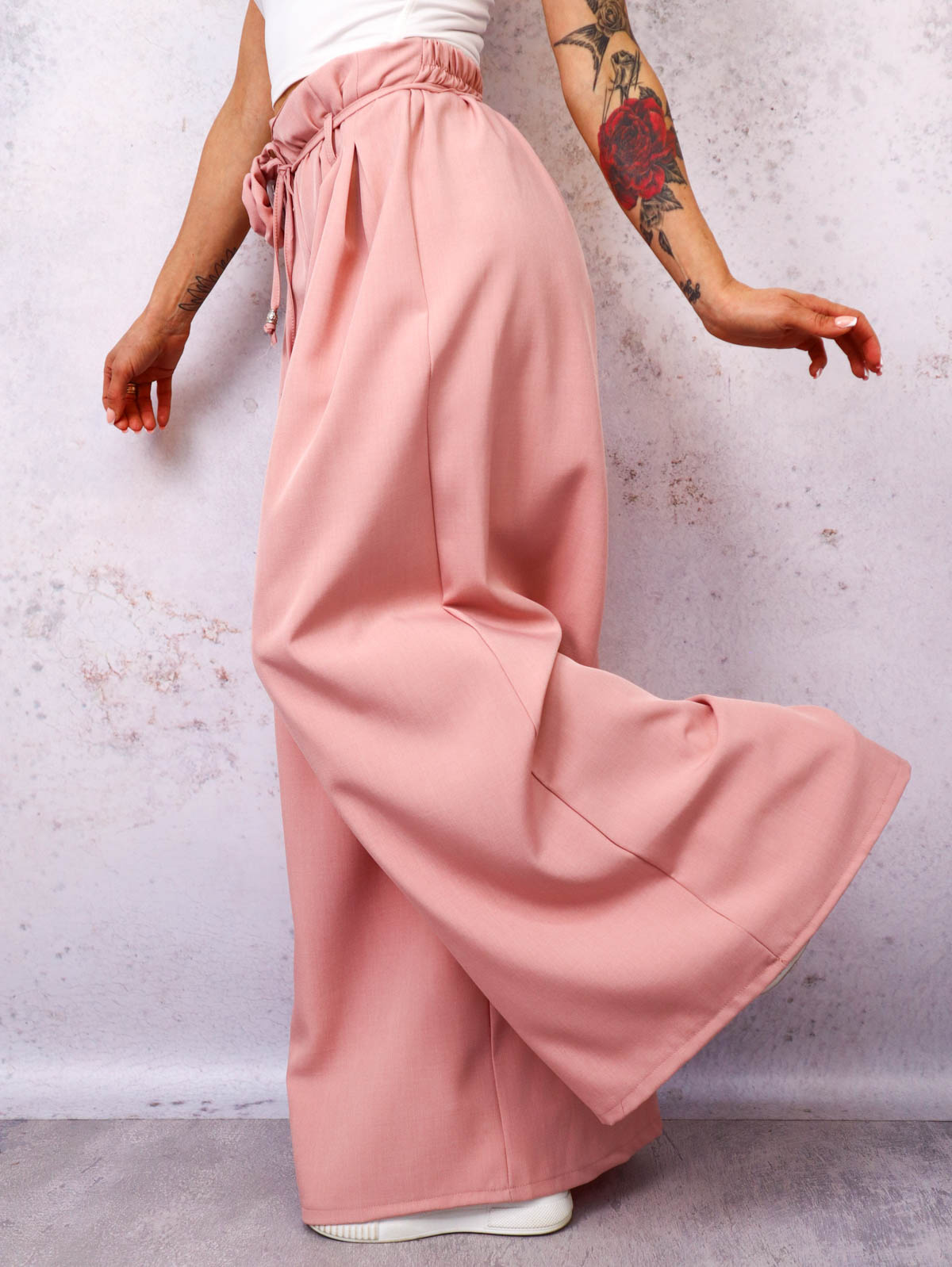 SPODNIE MATERIAŁOWE Z SZEROKIMI NOGAWKAMI I WIĄZANIEM W PASIE- PUDROWY RÓŻ