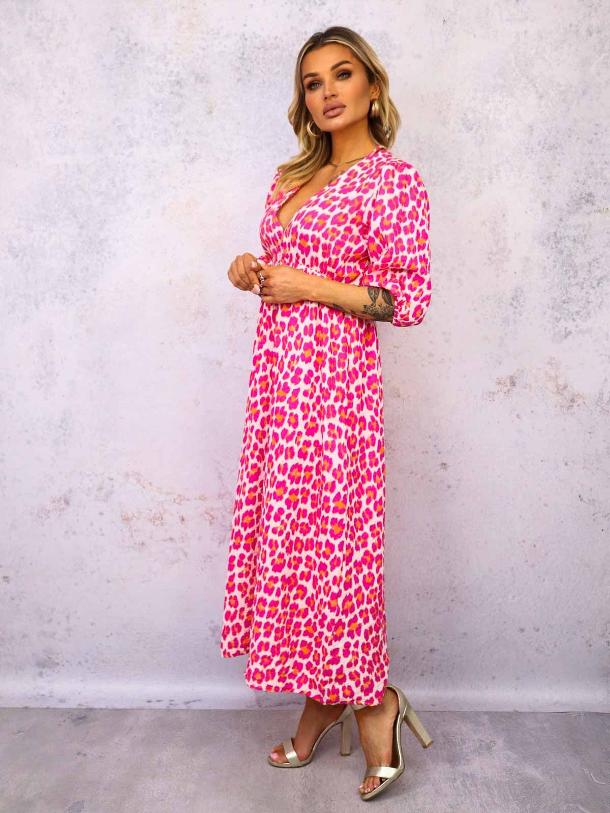 Sukienka maxi w cętki. Model z wiązaniem na plecach, rękawy zakończone gumką. W pasie wszyta guma dzięki której sukienka idealnie dopasuje się do sylwetki.