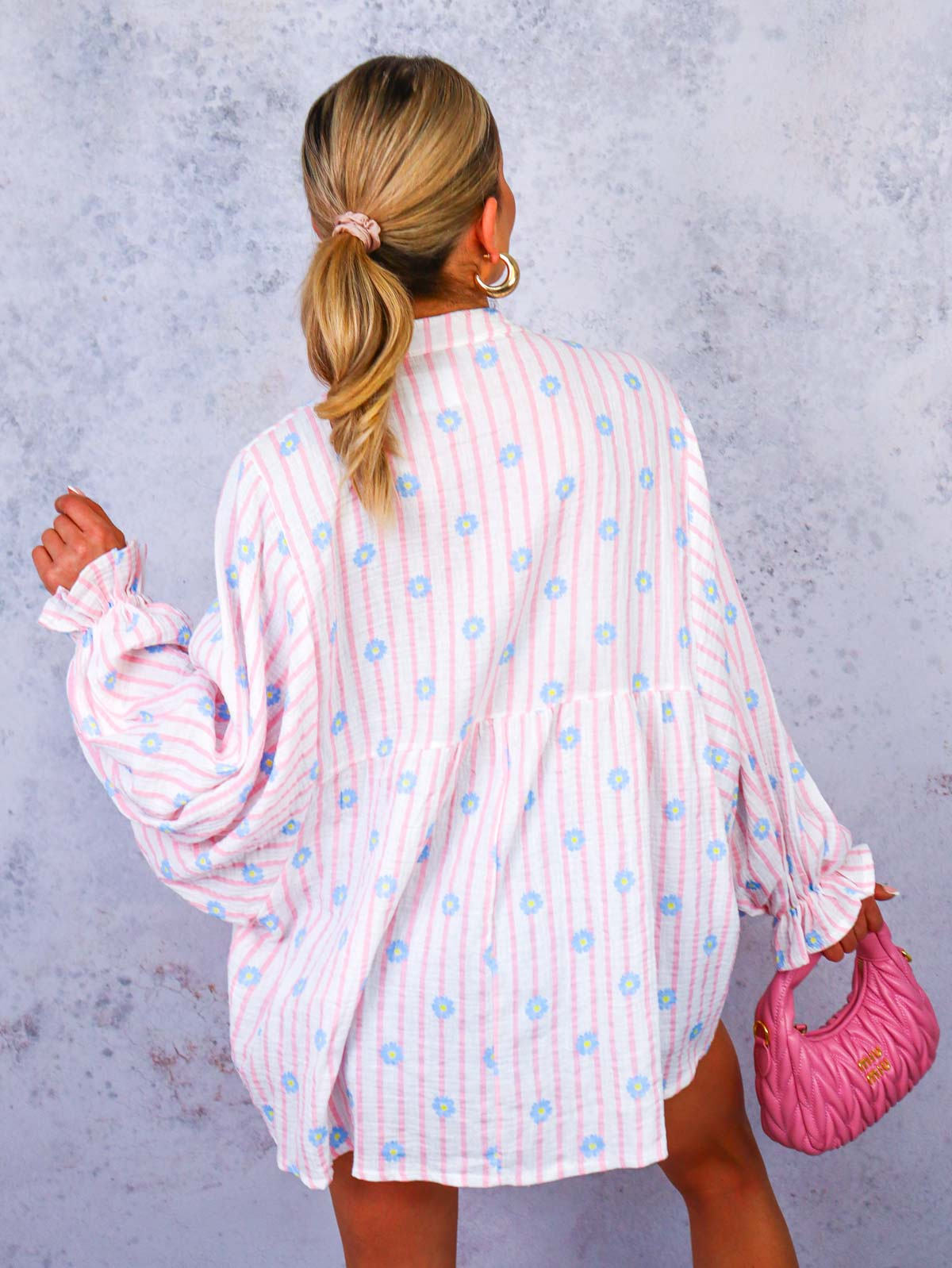 BLUZKA KOSZULOWA OVERSIZE W PASKI I KWIATY- RÓŻOWA