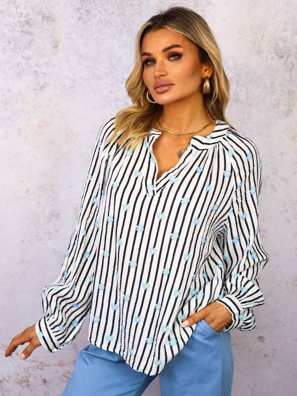 BLUZKA KOSZULOWA W PASKI I KWIATKI- CZARNA