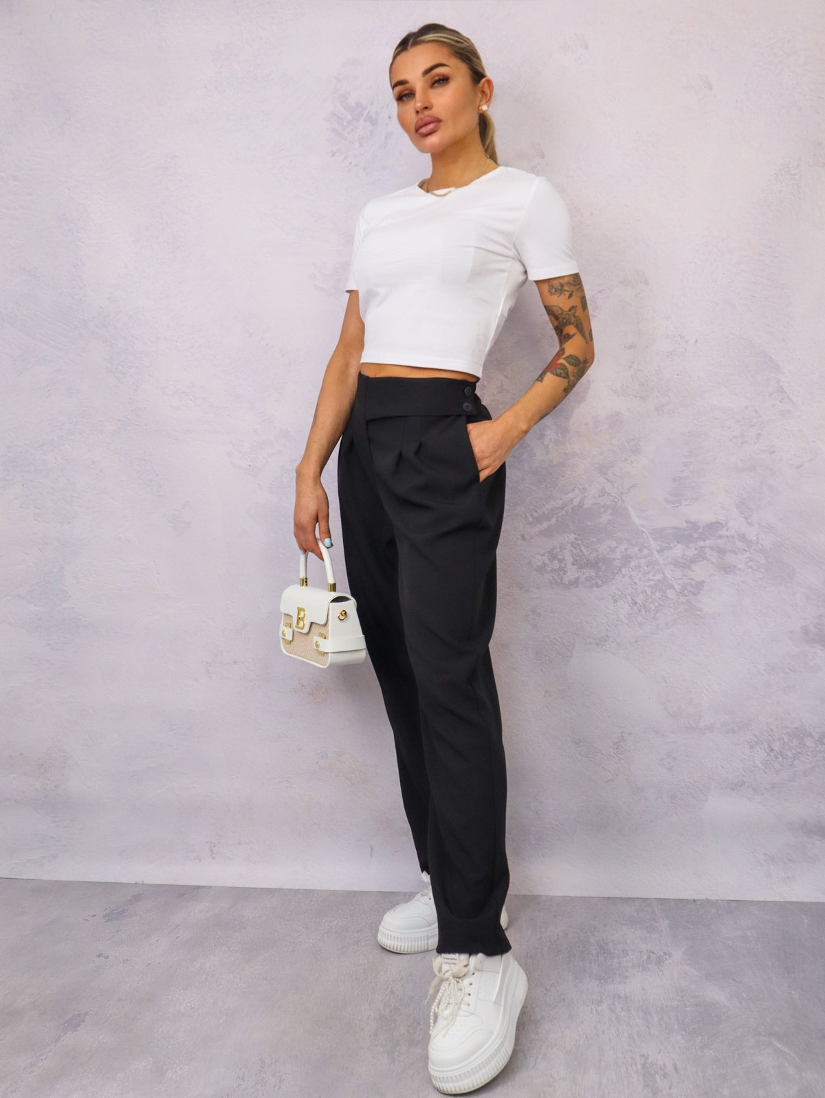 SPODNIE MATERIAŁOWE Z OZDOBNYM ZAPIĘCIEM NA BOKU- CZARNE