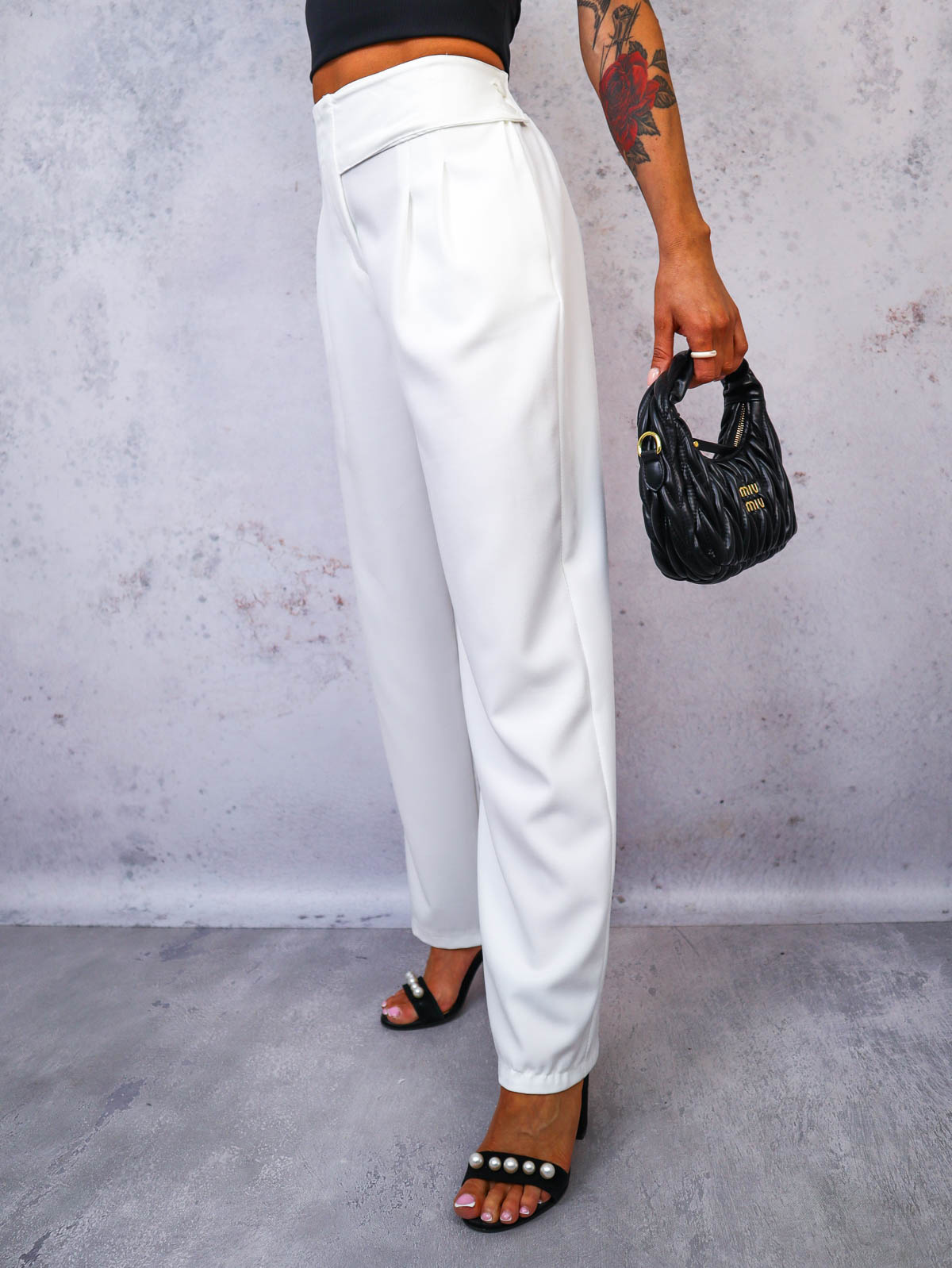 SPODNIE MATERIAŁOWE Z OZDOBNYM ZAPIĘCIEM NA BOKU- BIAŁE