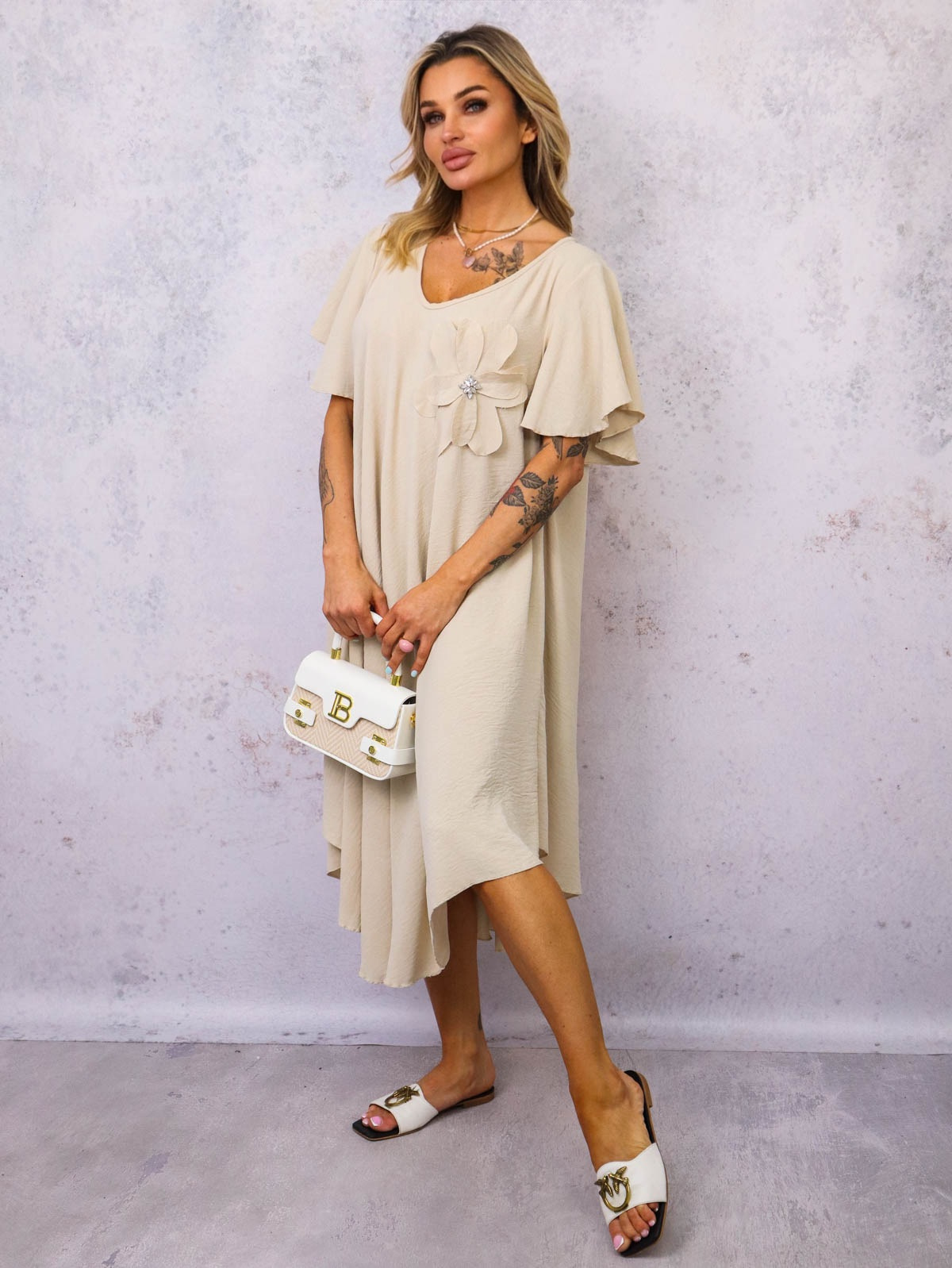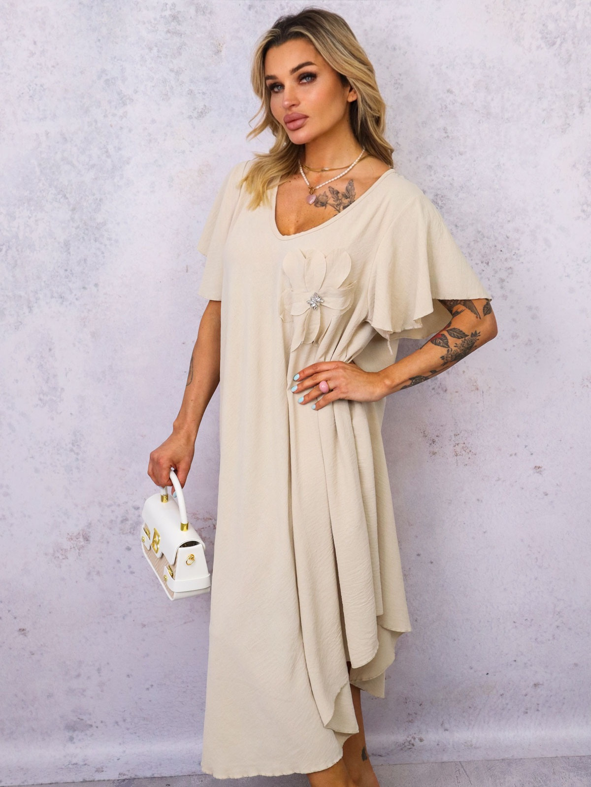 SUKIENKA Z KWIATEM I FALBANAMI NA RĘKAWACH- BEŻOWA