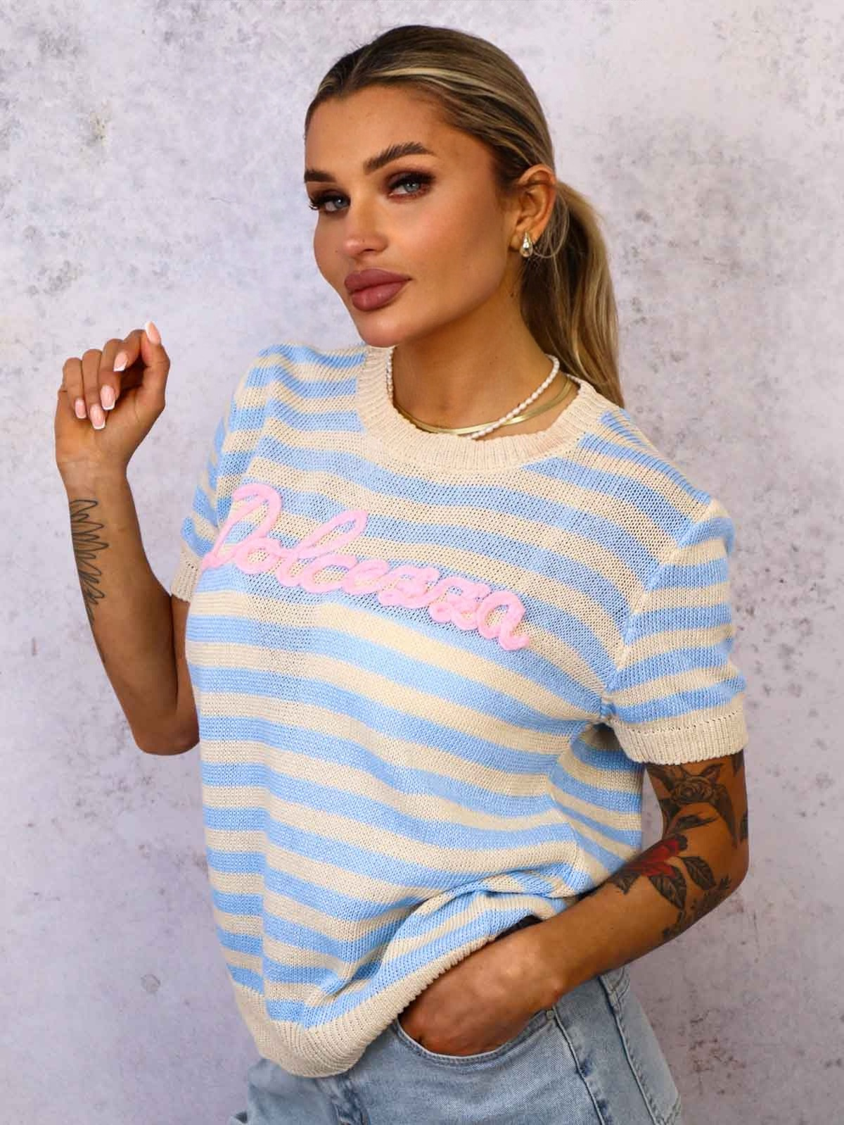 Sweter w paski z krótkim rękawem i ozdobnym, wyszywanym napisem.