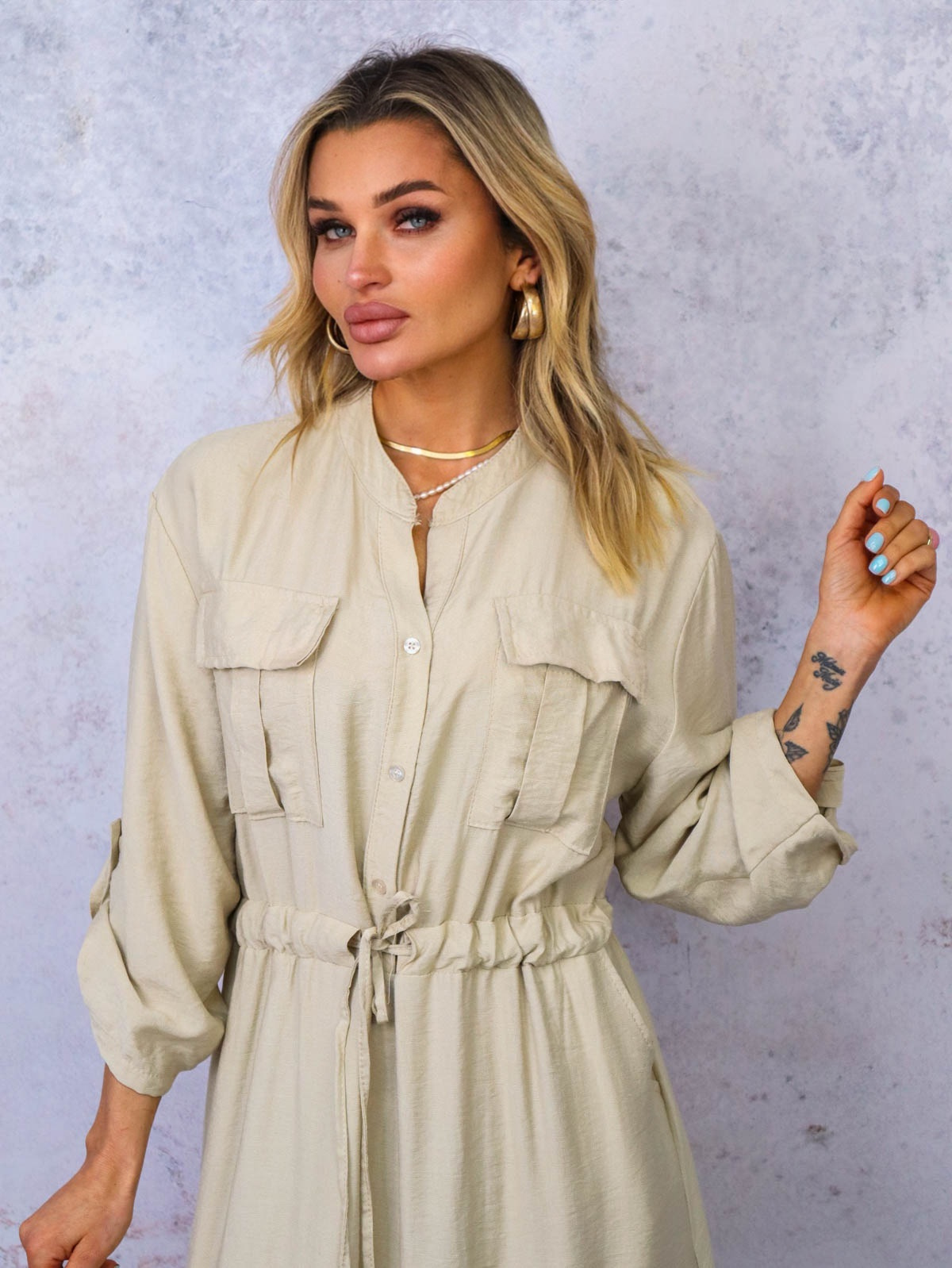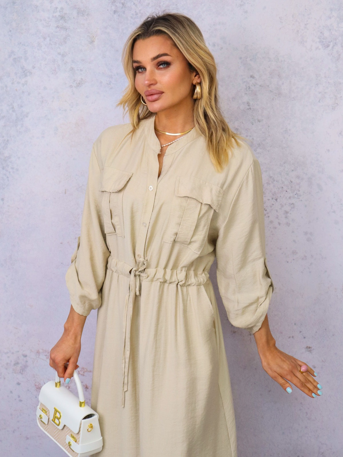 SUKIENKA WIĄZANA W PASIE Z KIESZENIAMI Z PRZODU- BEŻOWA