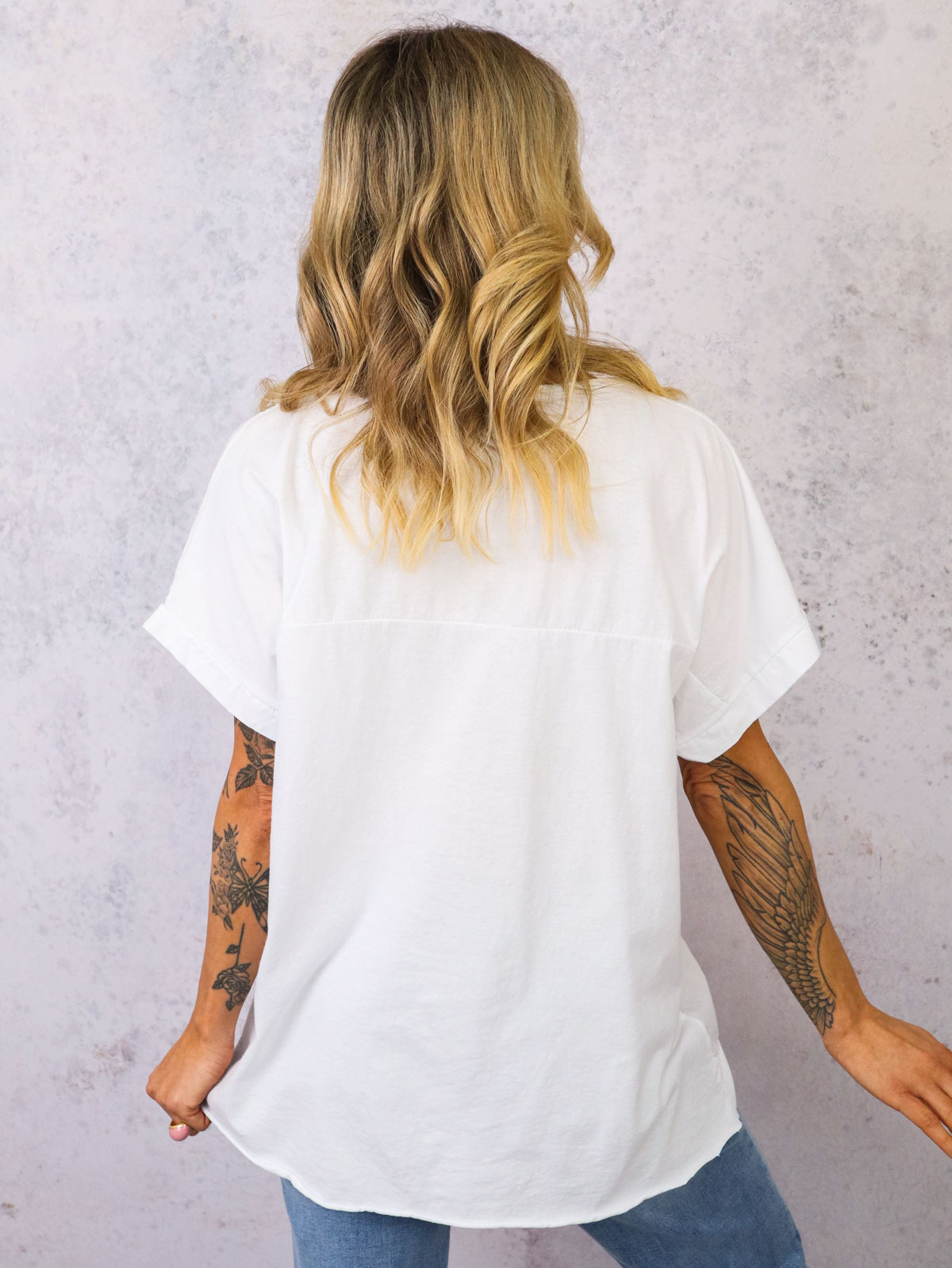 T-shirt z dekoltem w szpic z ozdobnym złotym kwiatem z przodu. Surowo zakończony na dole.