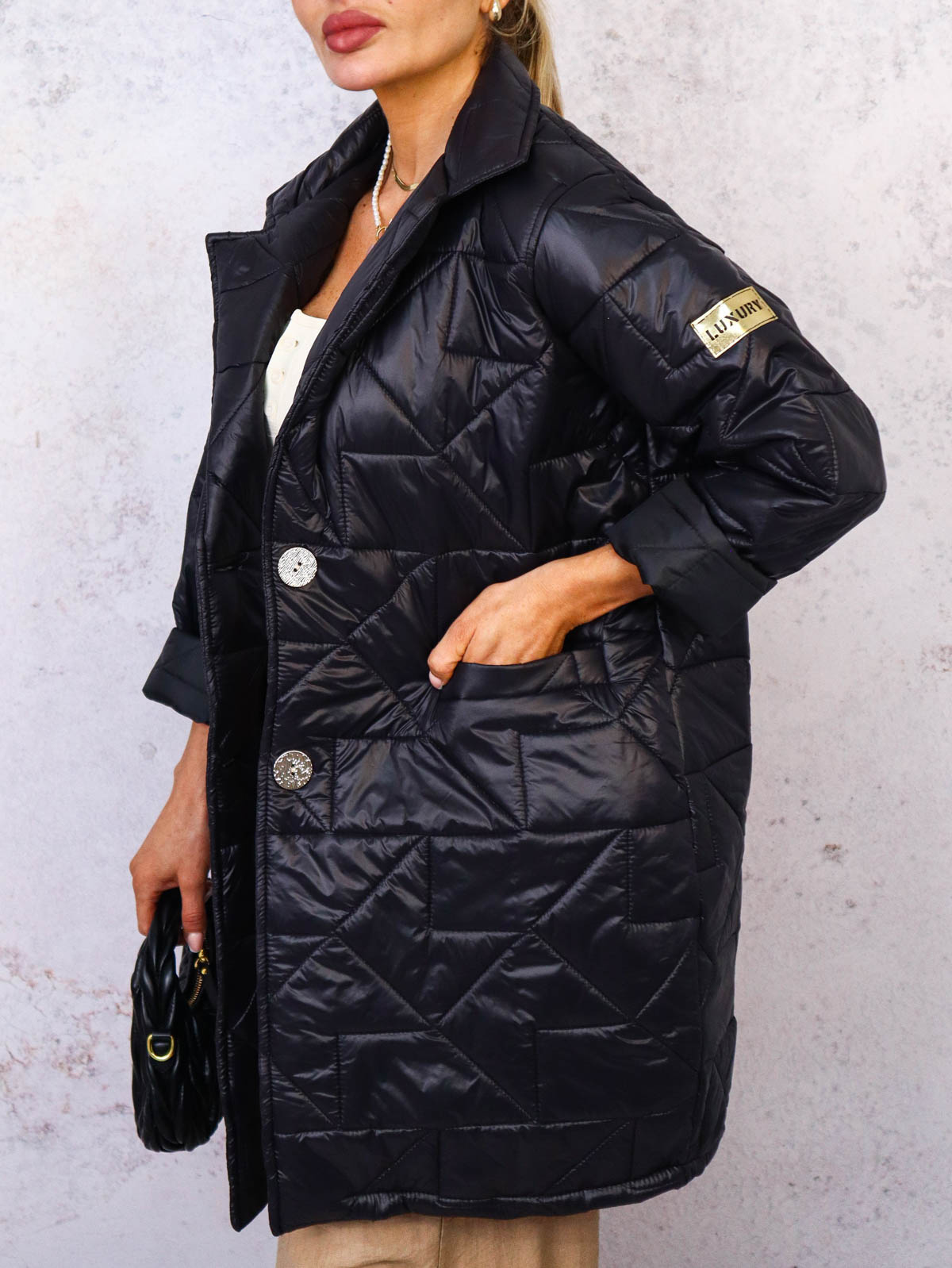 PIKOWANY PŁASZCZ ZAPINANY NA ZŁOTE GUZIKI- CZARNY