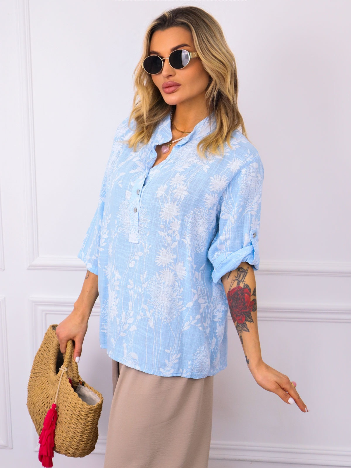 BLUZKA KOSZULOWA W KWIECISTE WZORY- NIEBIESKA