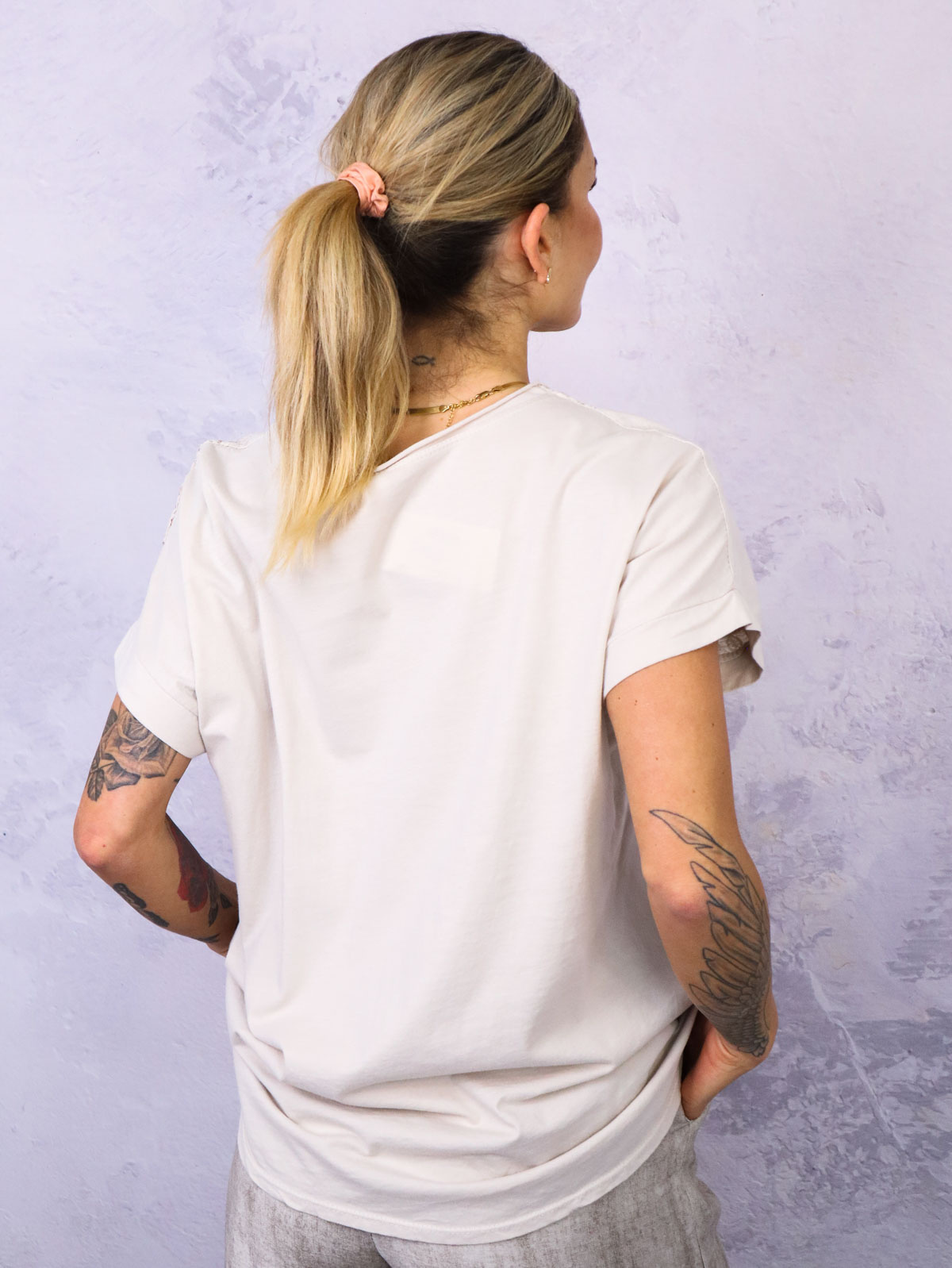 BLUZKA Z HAFTOWANYM WZOREM ZDOBIONA CEKINAMI- BEŻOWA