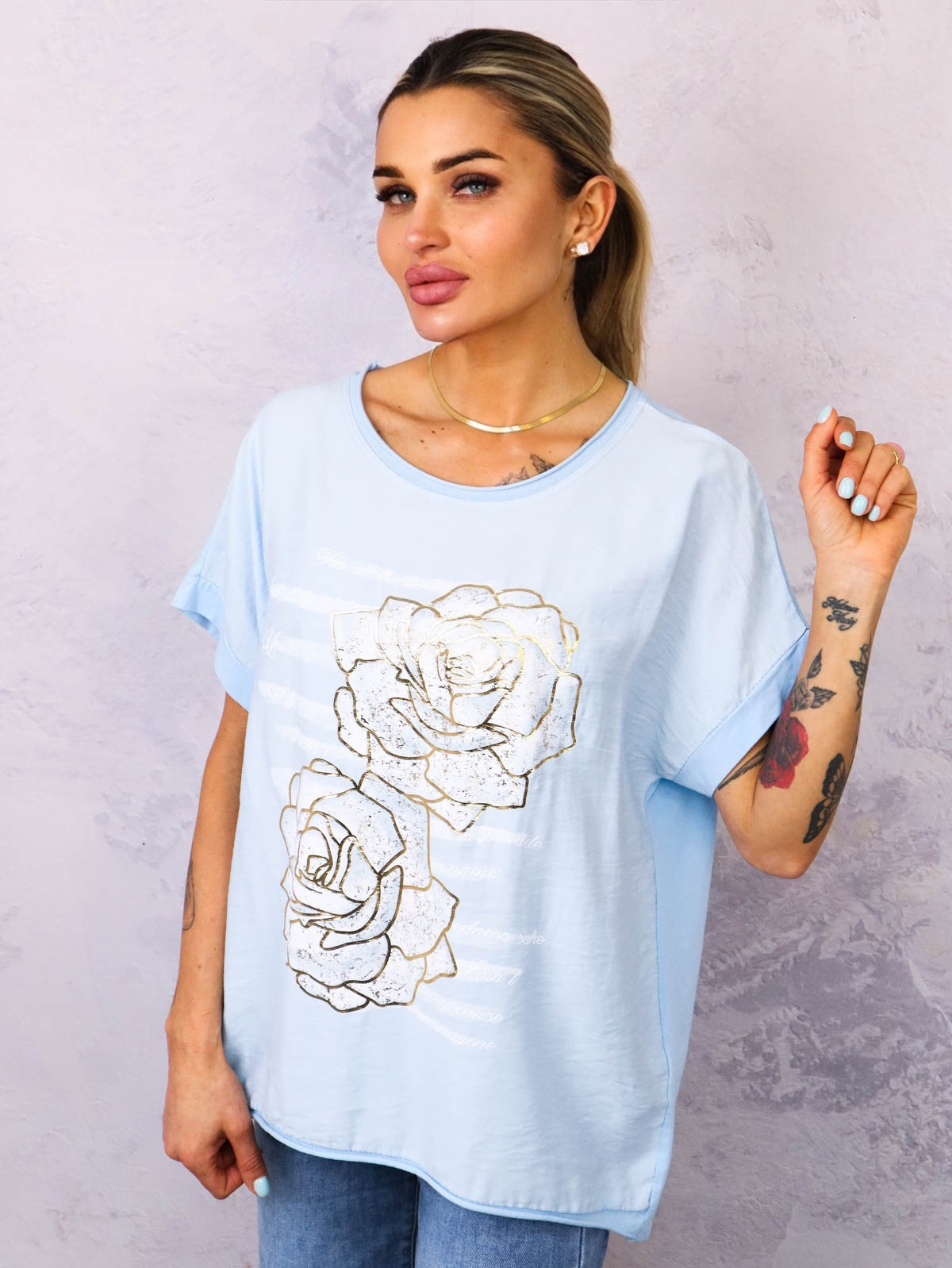 BLUZKA Z OZDOBNYMI ZŁOTYMI KWIATAMI- NIEBIESKA