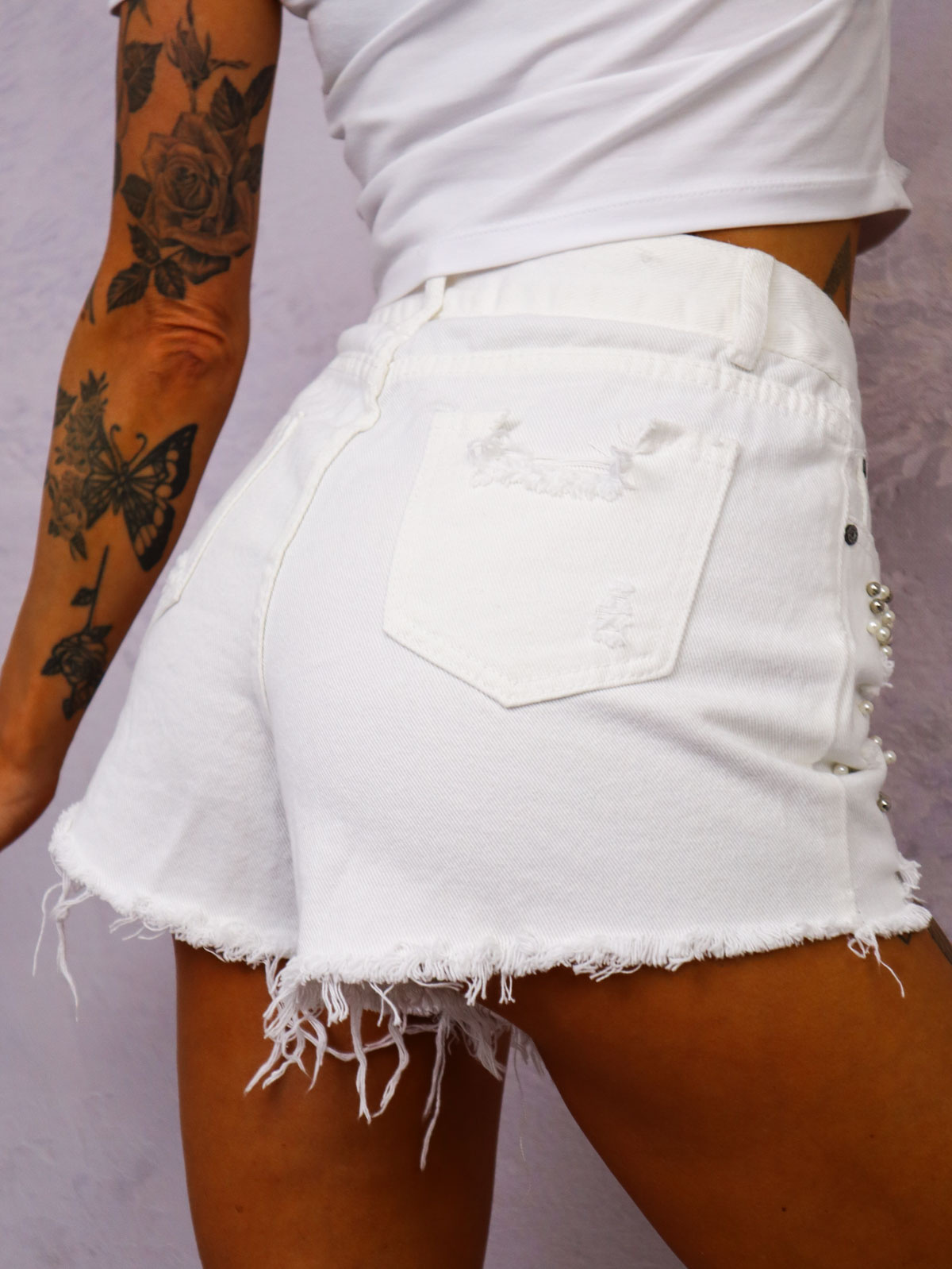SZORTY JEANSOWE ZDOBIONE PEREŁKAMI- BIAŁE