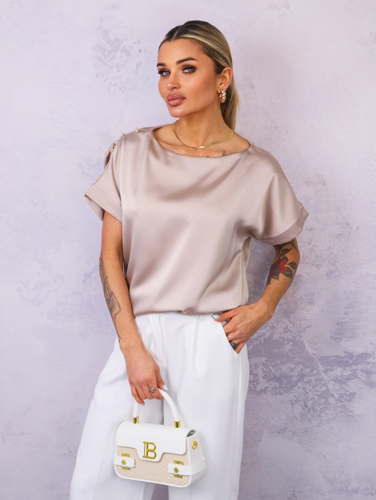 SATYNOWA BLUZKA Z OZDOBNYMI GUZIKAMI NA RAMIENIU- BEŻOWA