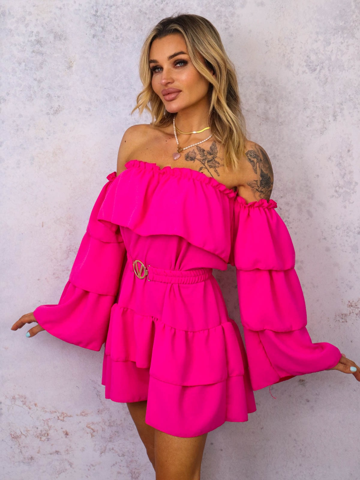 KOMBINEZON HISZPANKA Z FALBANAMI I PASKIEM- FUKSJA