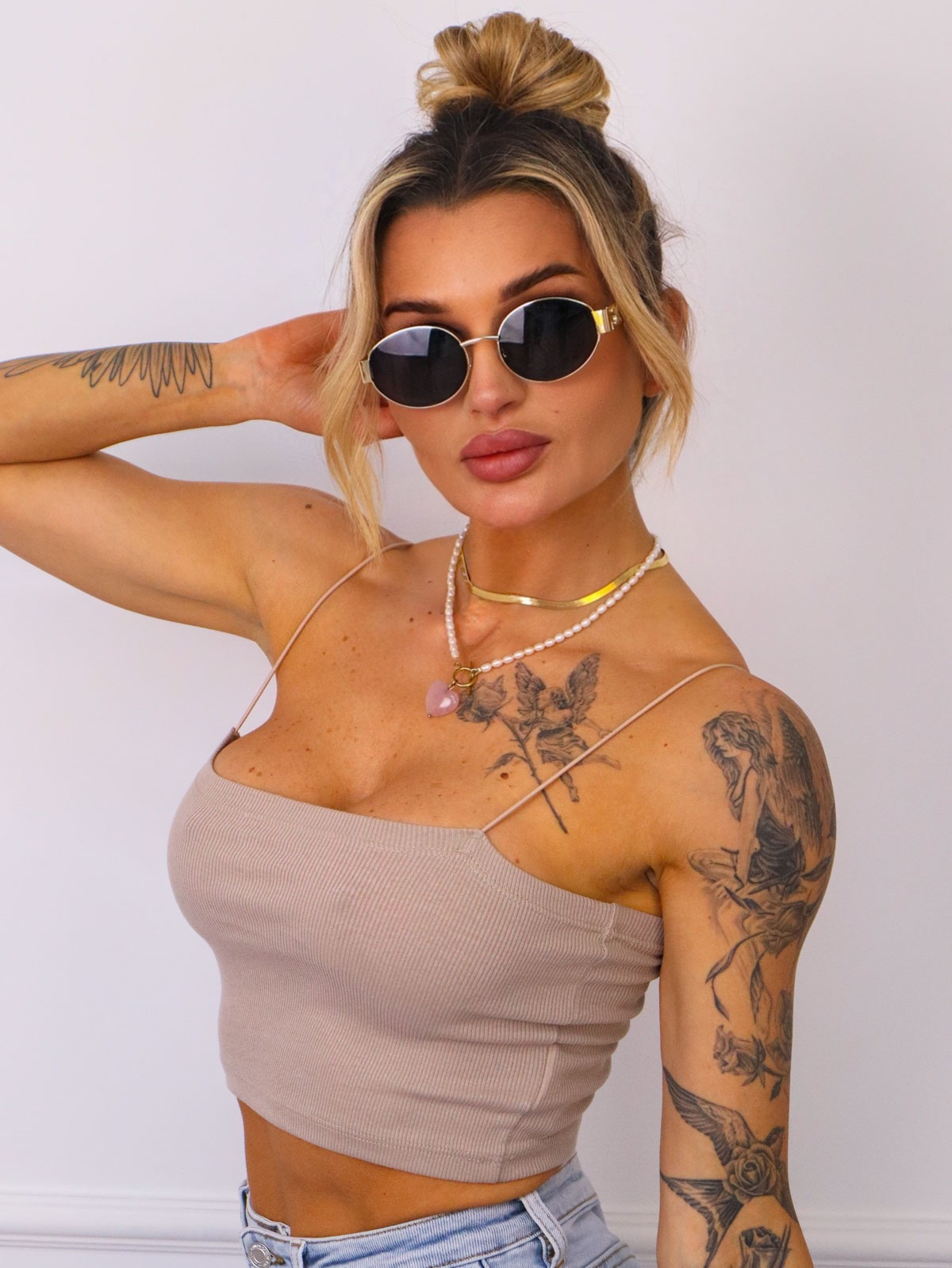 TOP PRĄŻKOWANY NA RAMIĄCZKACH- BEŻOWY
