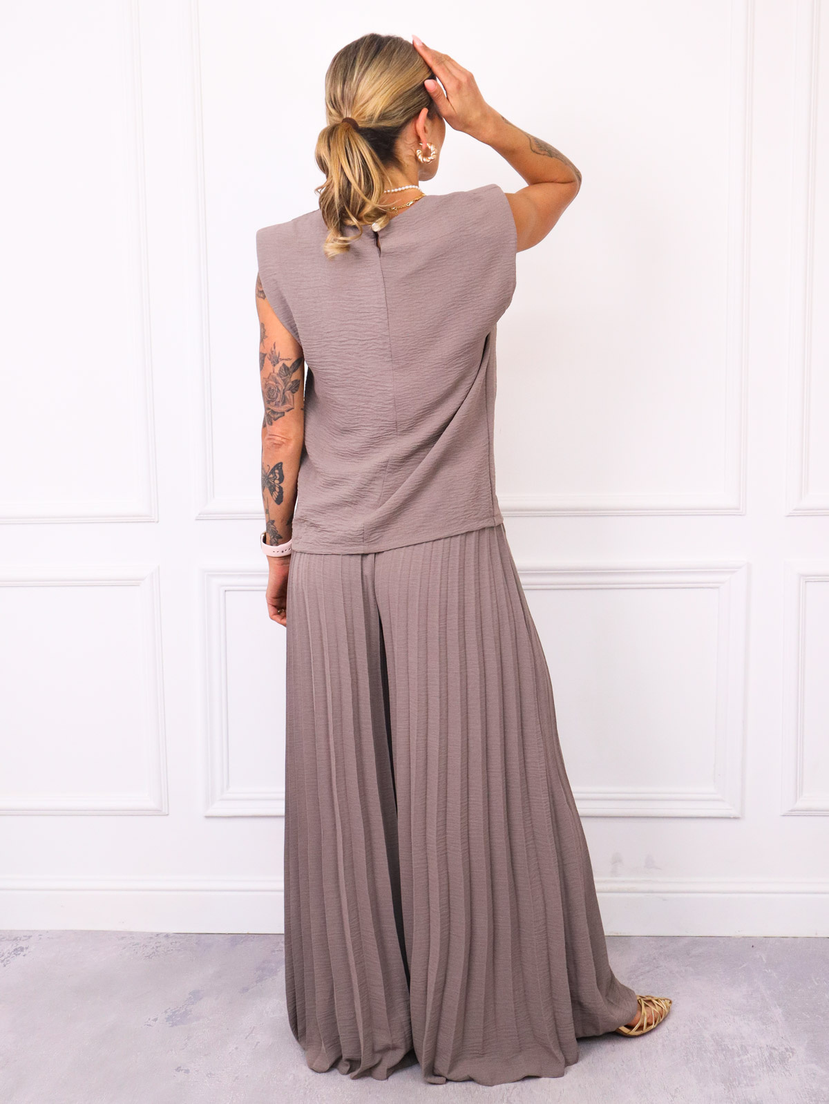 Komplet bluzka zapinana z tyłu na złoty guzik+ spodnie z szerokimi, plisowanymi nogawkami.