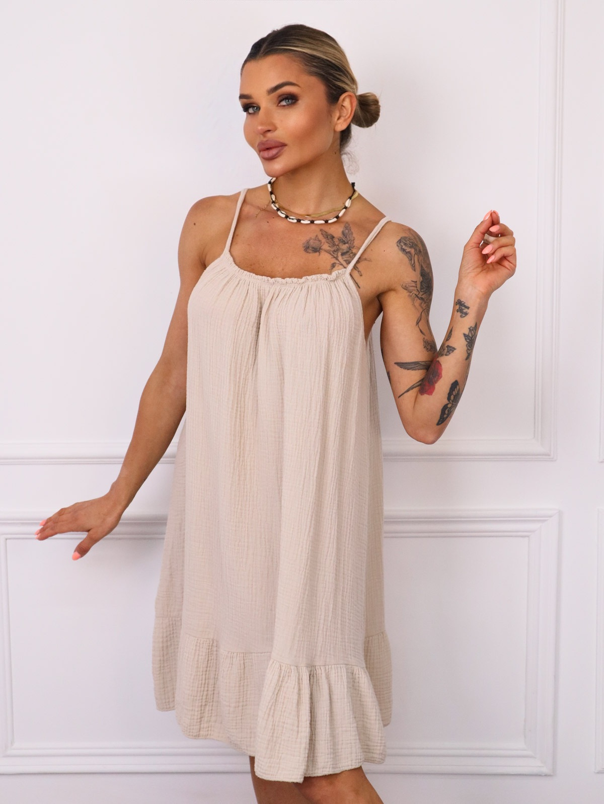 SUKIENKA MINI MUŚLNOWA NA RAMIĄCZKA Z FALBANĄ- BEŻOWA