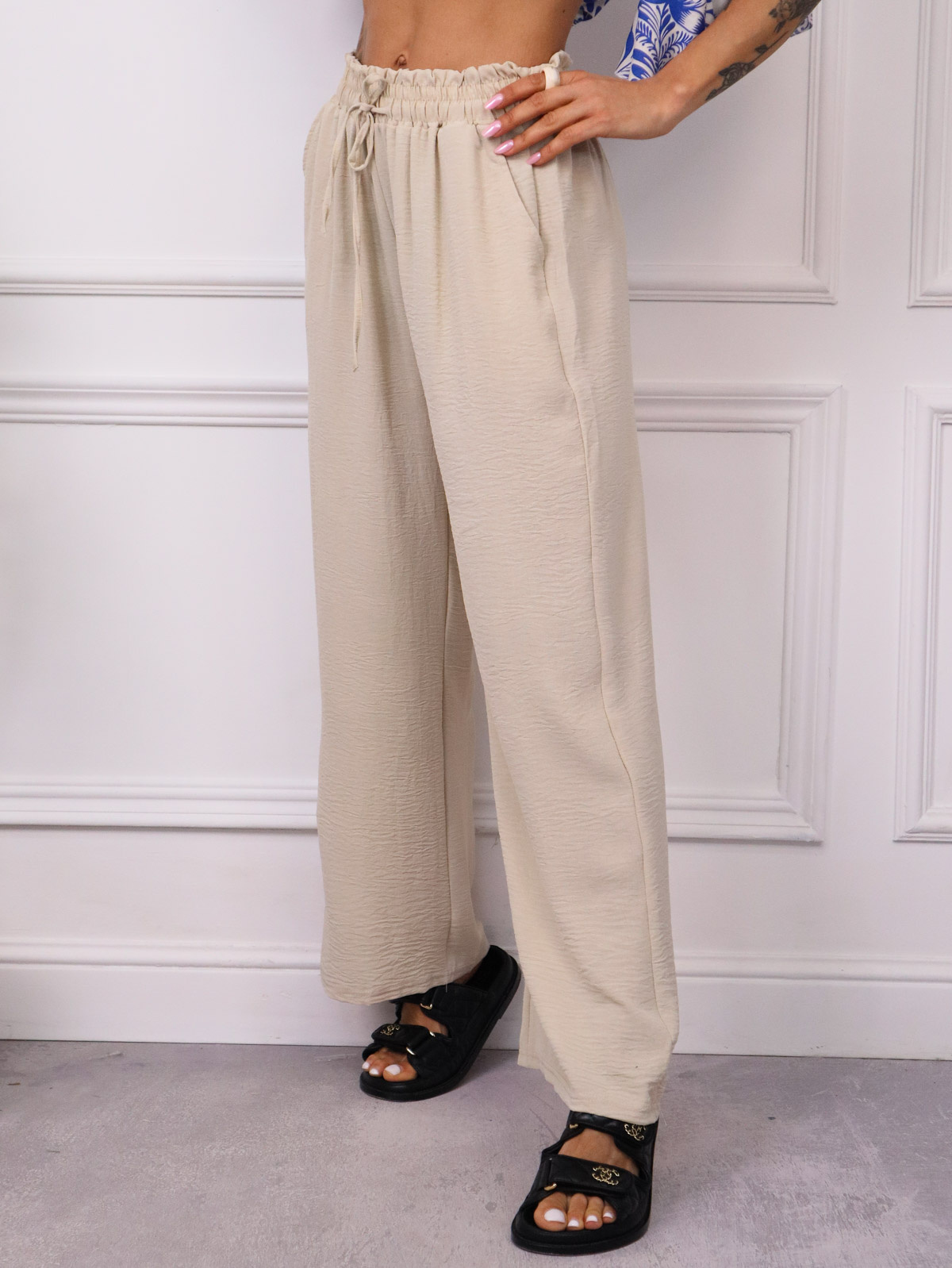 SPODNIE MUŚLINOWE Z WIĄZANIEM I GUMĄ W PASIE- BEŻOWE