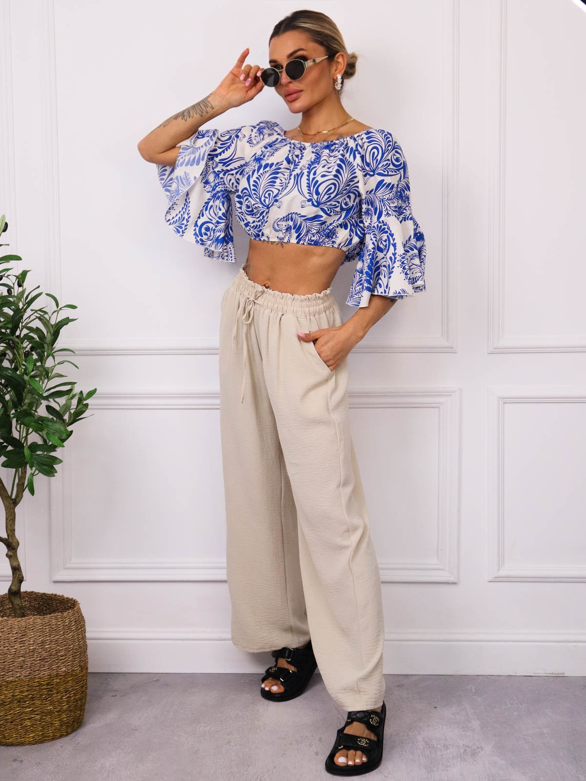 Spodnie muślinowe z wiązaniem i gumą w pasie.