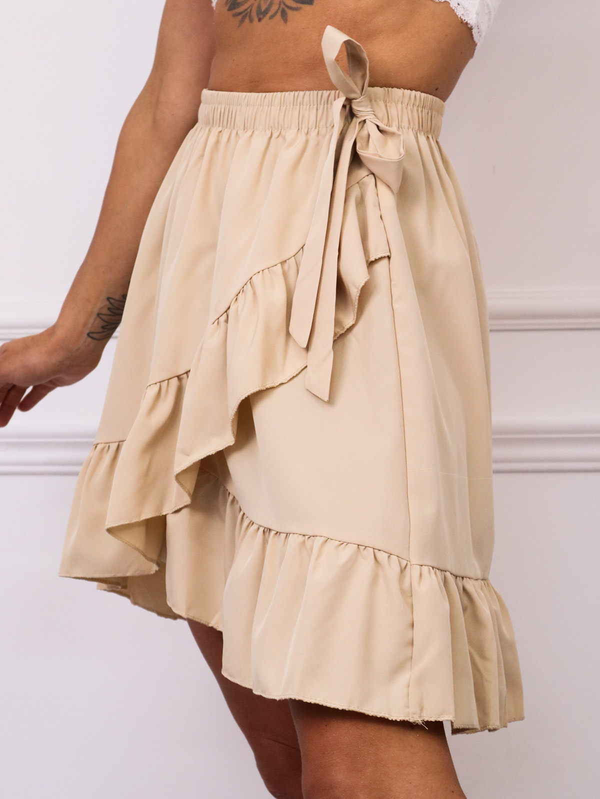 SPÓDNICA Z FALBANAMI WIĄZANA W PASIE- BEŻOWA