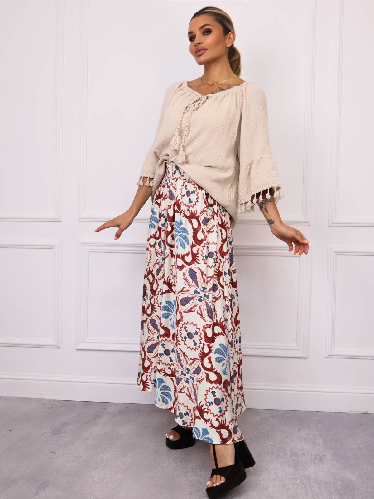 SPÓDNICA MAXI WZORZYSTA Z GUMĄ W PASIE- CZERWONA