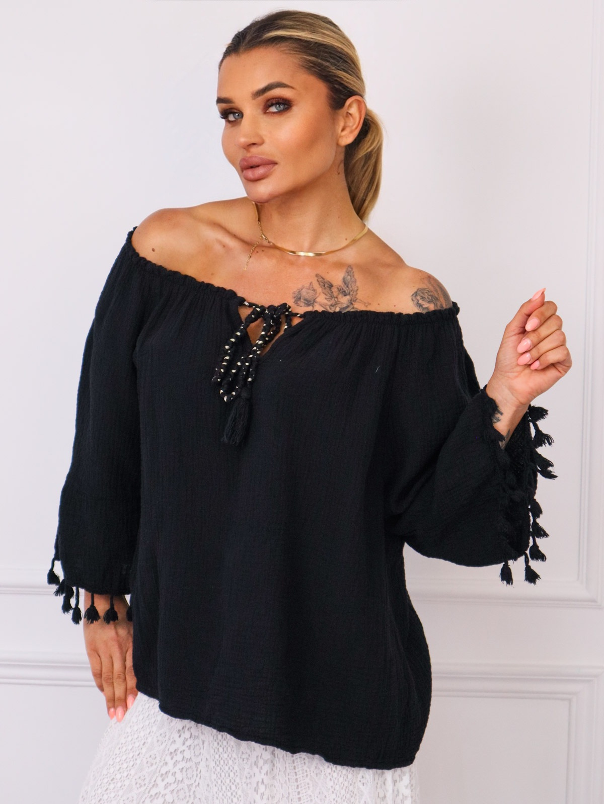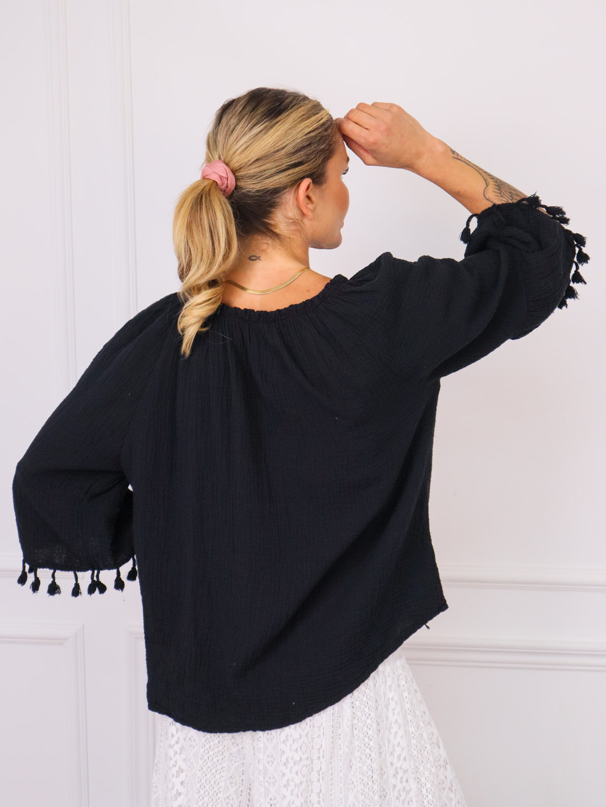 BLUZKA Z WIĄZANIEM I FRĘDZLAMI PRZY RĘKAWACH- CZARNA