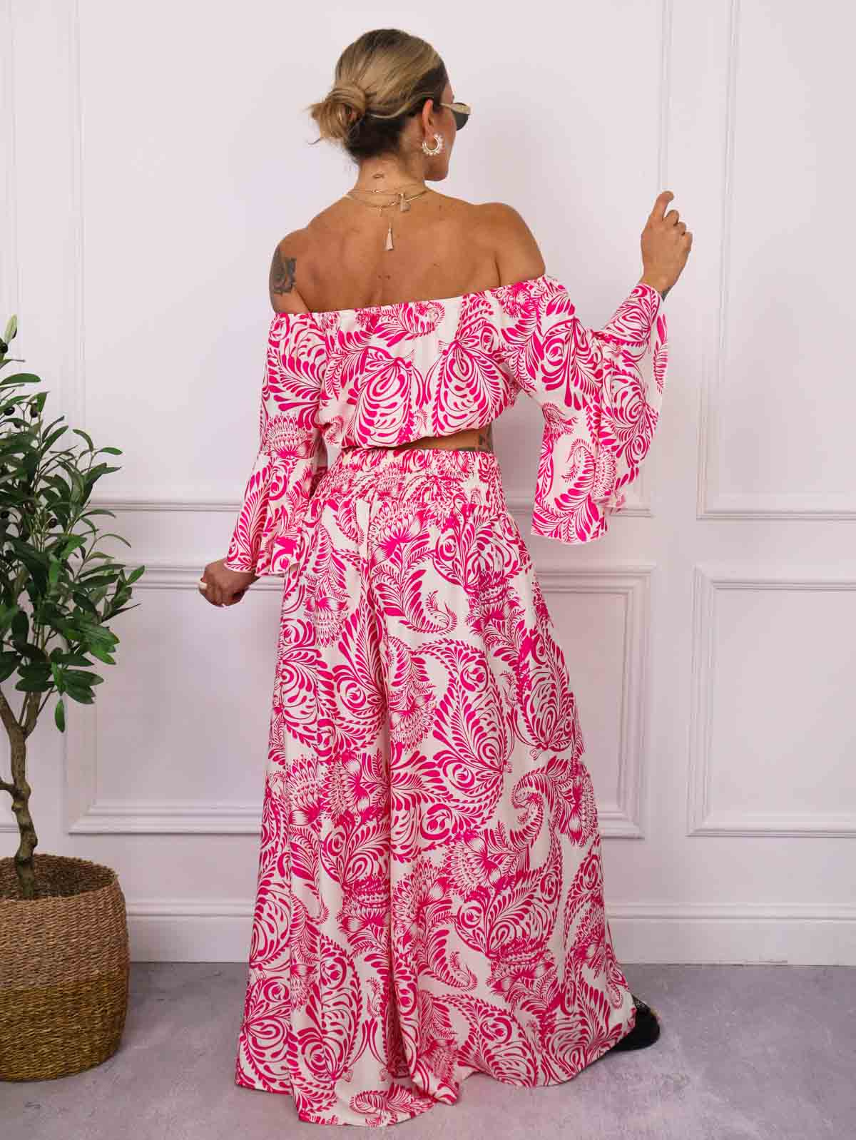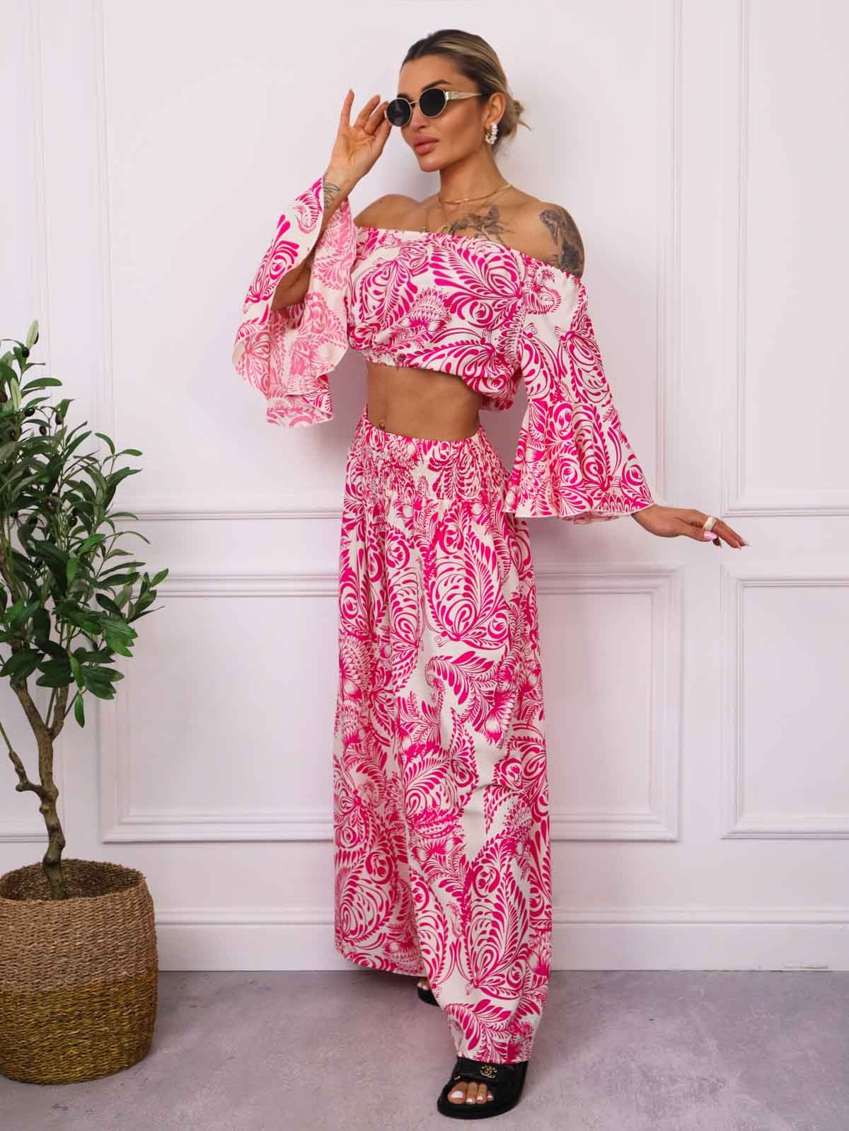 KOMPLET WZORZYSTY TOP+ SPODNIE- FUKSJA