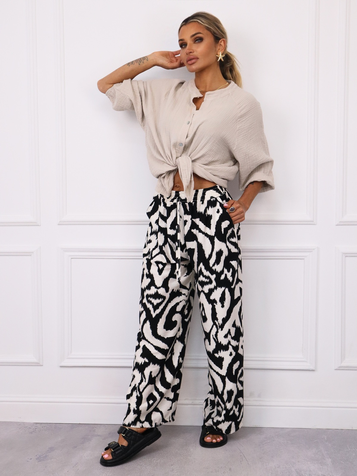 SPODNIE WZORZYSTE Z GUMĄ I WIĄZANIEM W PASIE- CZARNE