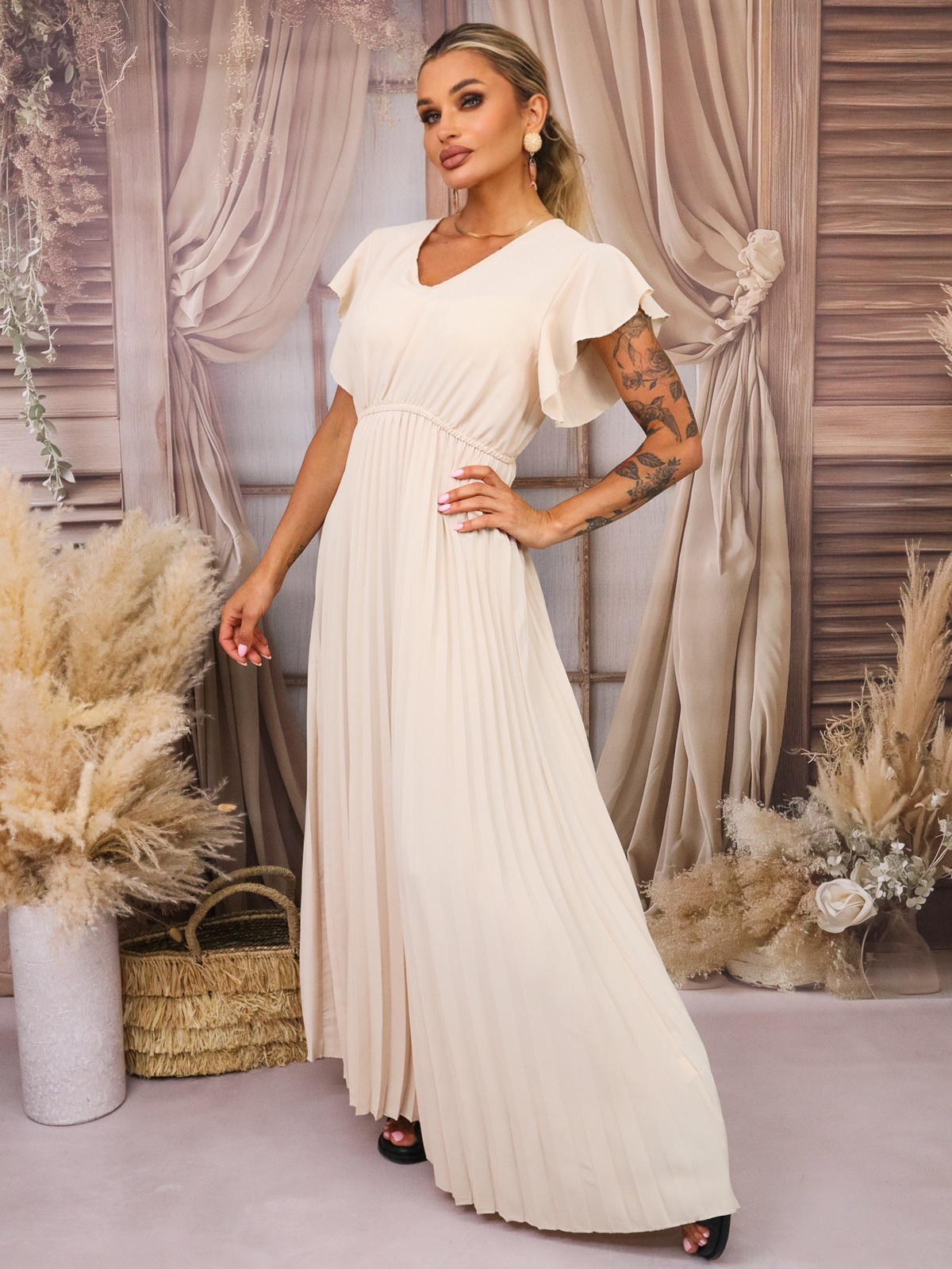 SUKIENKA MAXI PLISOWANA Z FALBANAMI PRZY RĘKAWACH- BEŻOWA