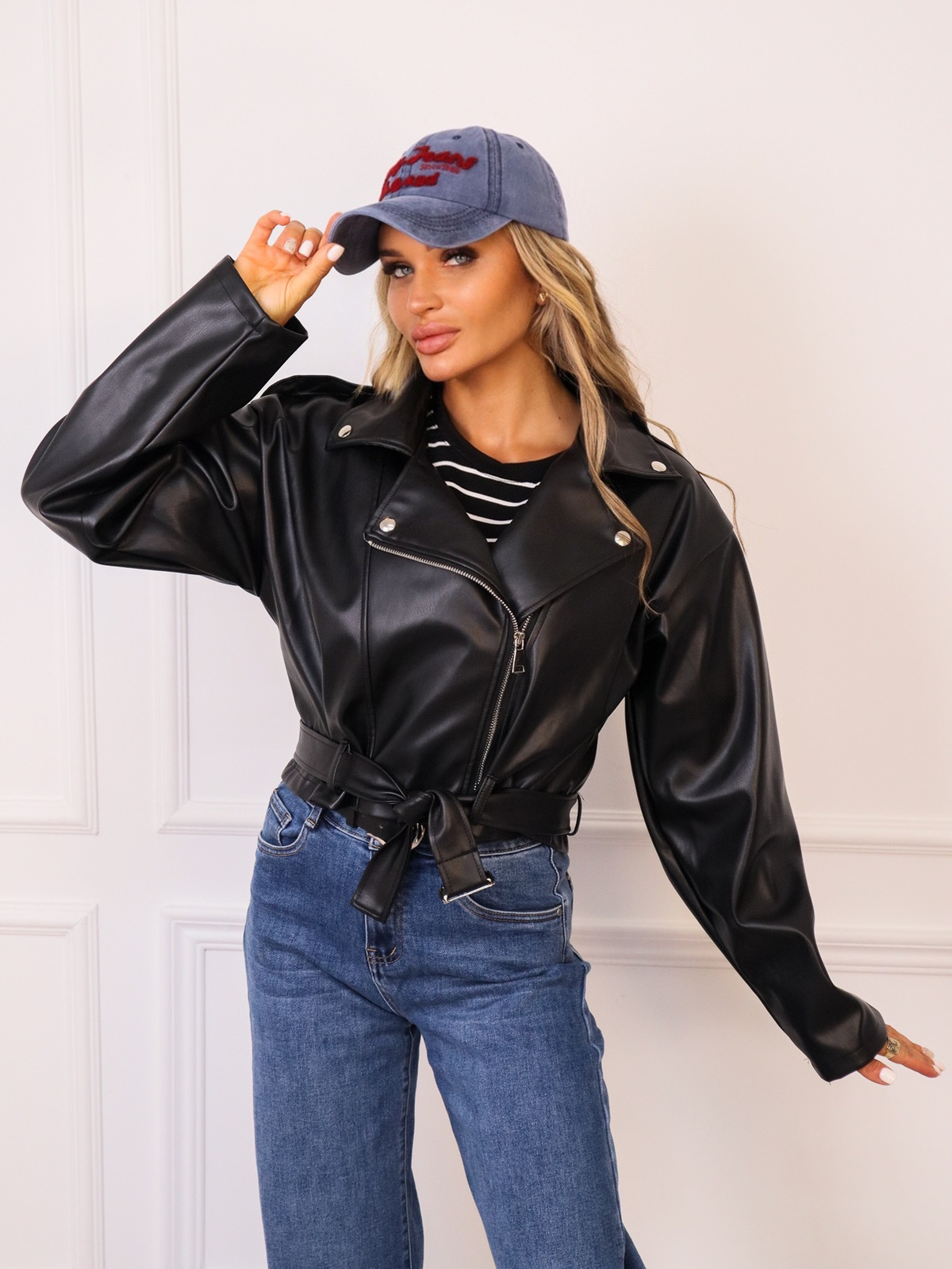 KURTKA RAMONESKA Z PASKIEM- CZARNA
