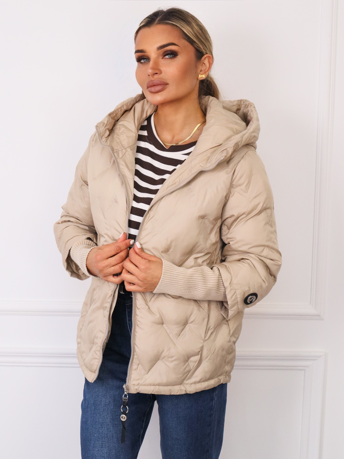 KURTKA PIKOWANA Z MATERIAŁOWYM ŚCIAGACZEM NA RĘKAWIE- BEŻOWA