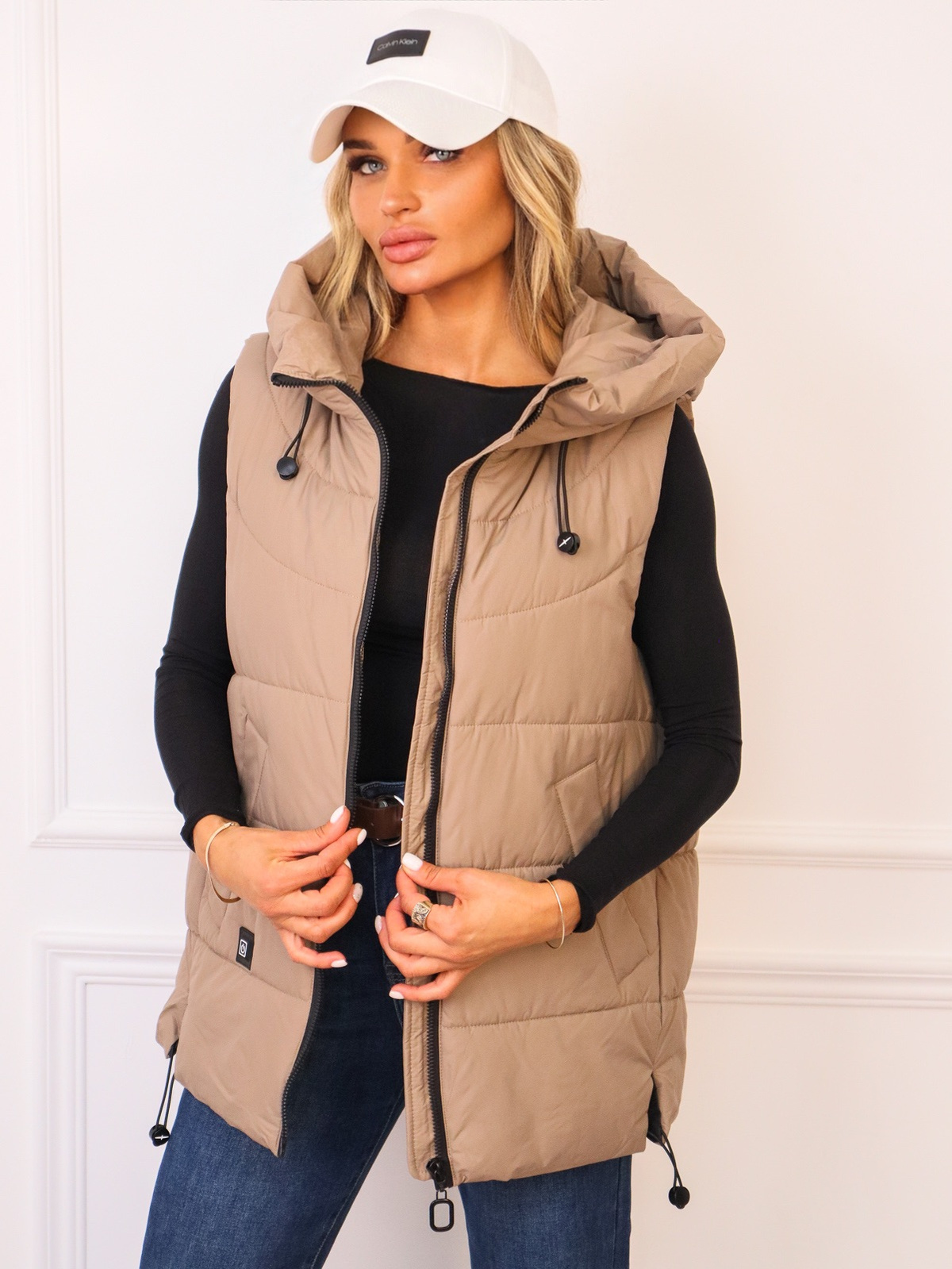 ASYMETRYCZNA KAMIZELKA Z KAPTUREM I ŚCIAGACZEM NA DOLE- CAPPUCCINO