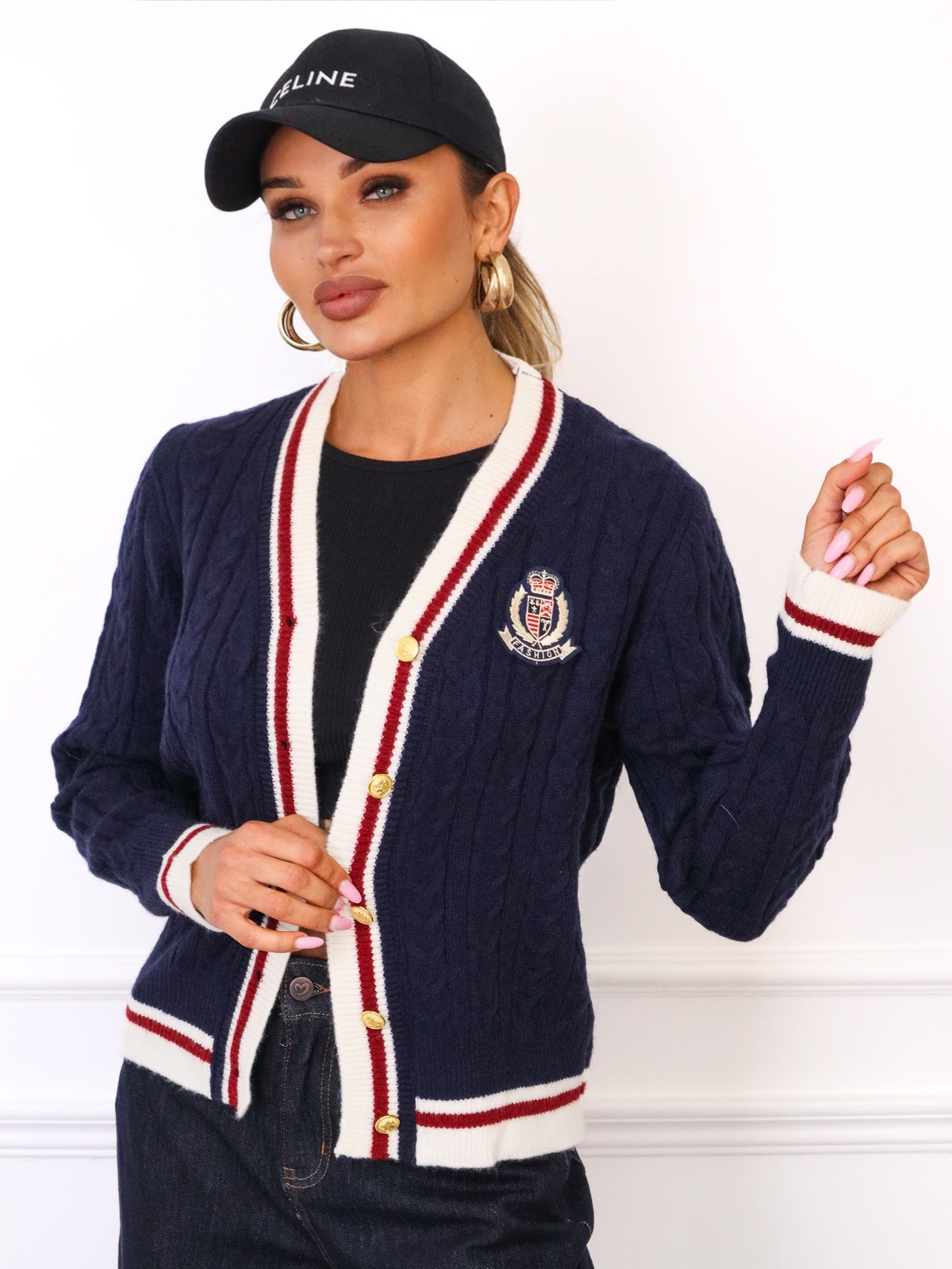 Sweter kardigan zapinany na guziki. Warkoczowy splot i kontrastowe wykończenia. Dekolt w szpic.