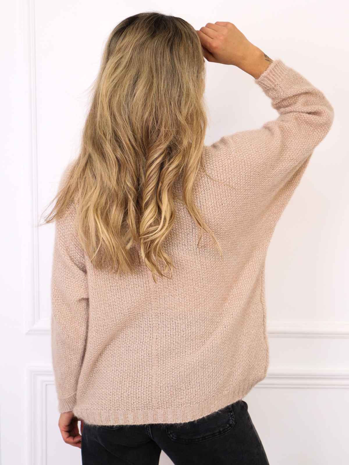 ASYMETRYCZNY SWETER Z DEKOLTEM W SZPIC Z DOMIESZKA WEŁNY I MOHERU- BEŻOWY