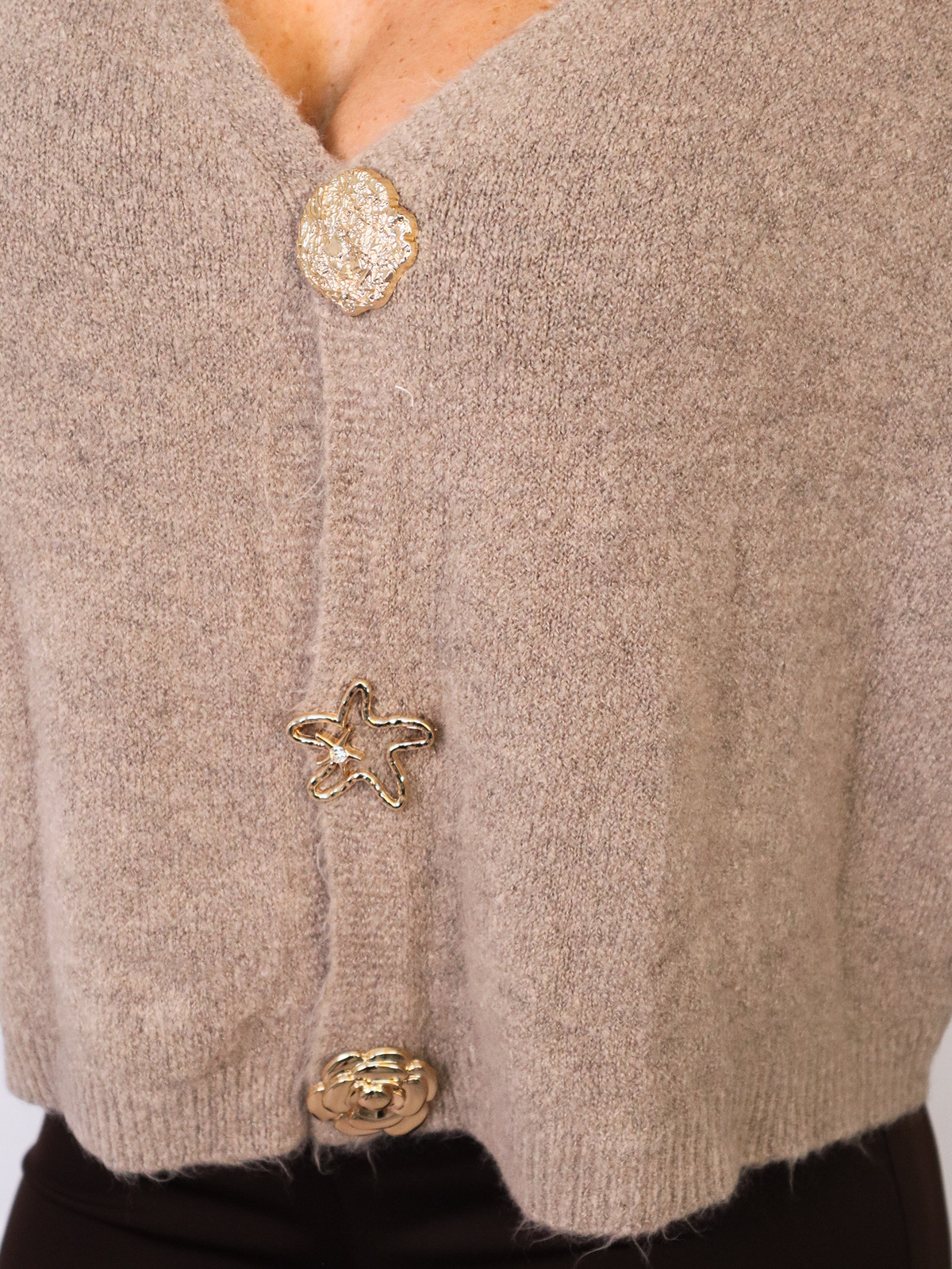 SWETER ZAPINANY NA ZŁOTE BROSZKI- JASNOBRĄZOWY