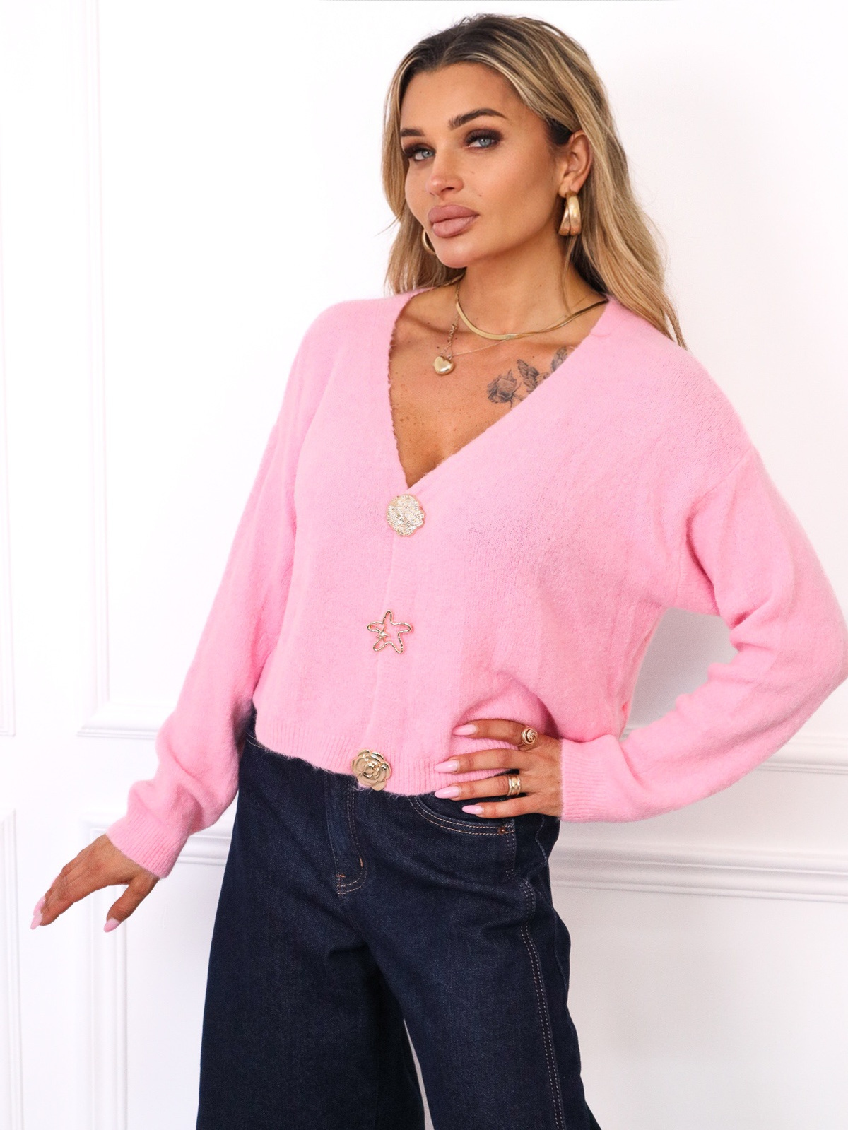 SWETER ZAPINANY NA ZŁOTE BROSZKI- RÓŻOWY