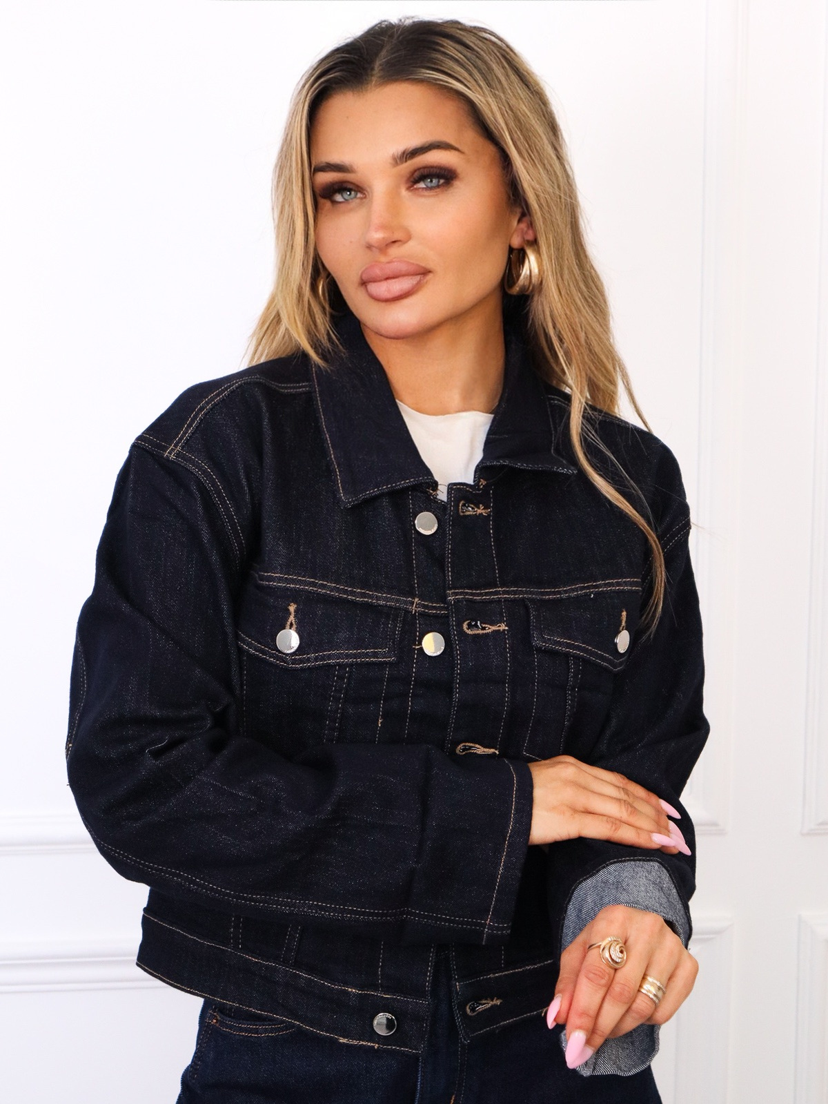 KURTKA JEANSOWA ZAPINANA NA GUZIKI Z PODWIJANYMI RĘKAWAMI- GRANATOWA