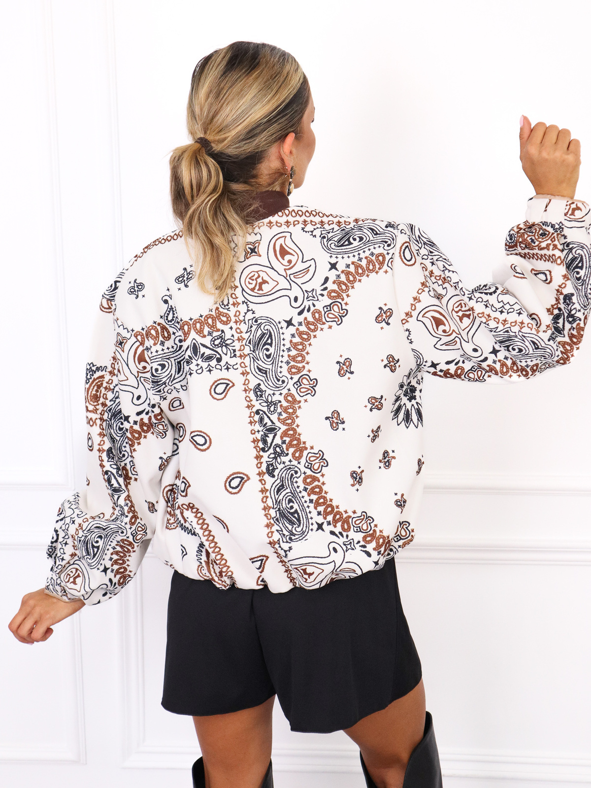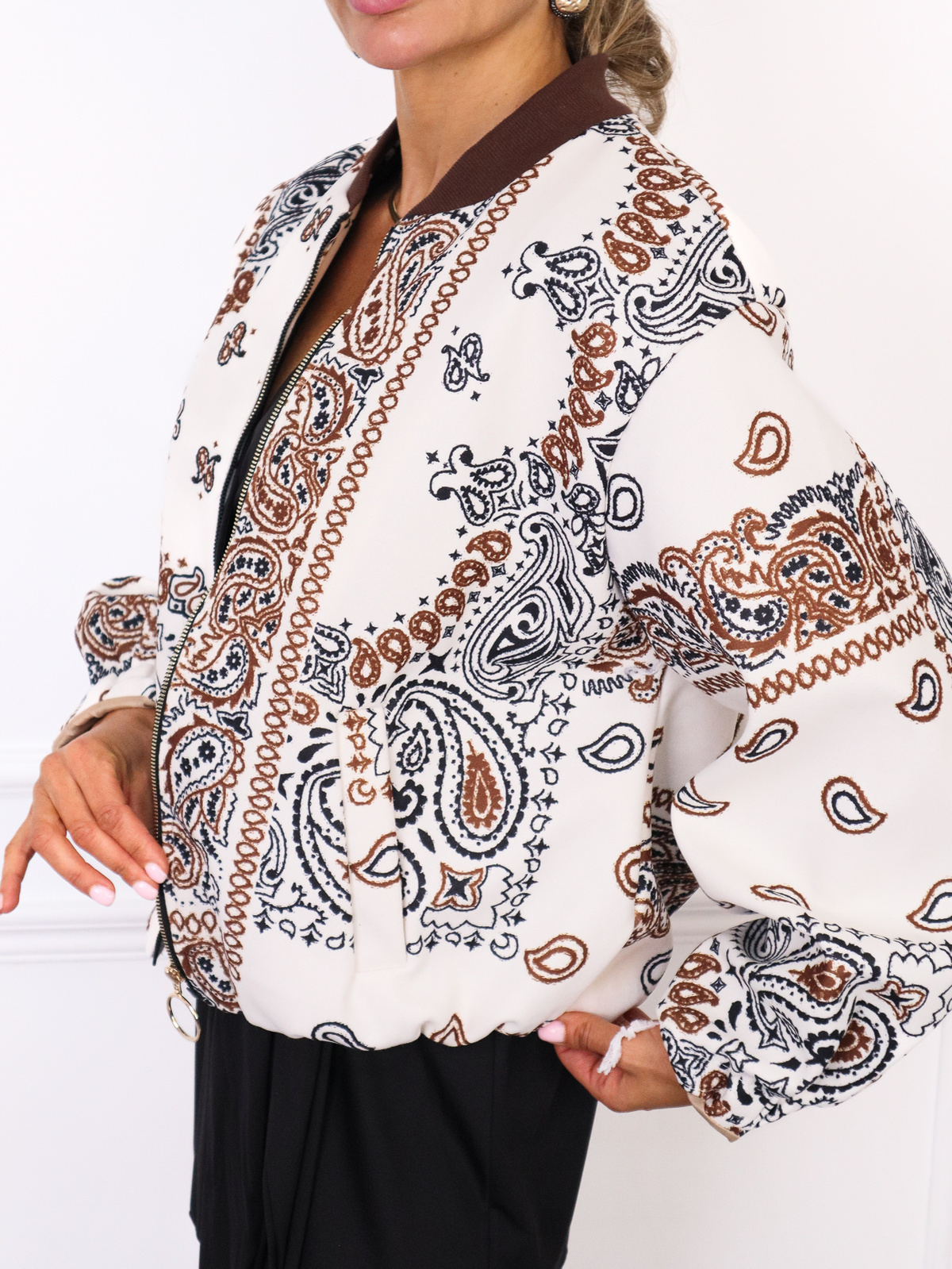 KURTKA BOMBERKA MATERIAŁOWA WE WZORY- BIAŁA