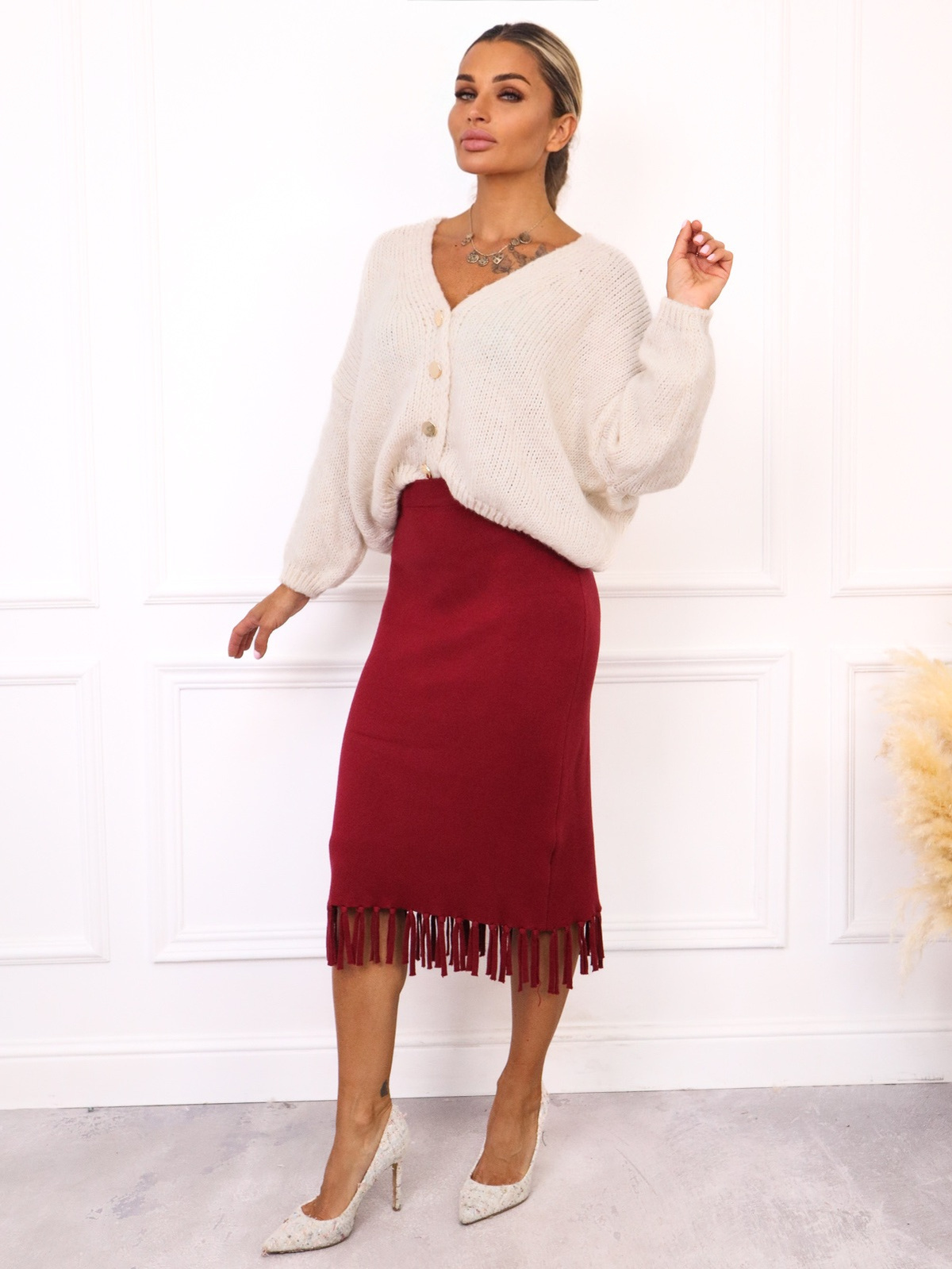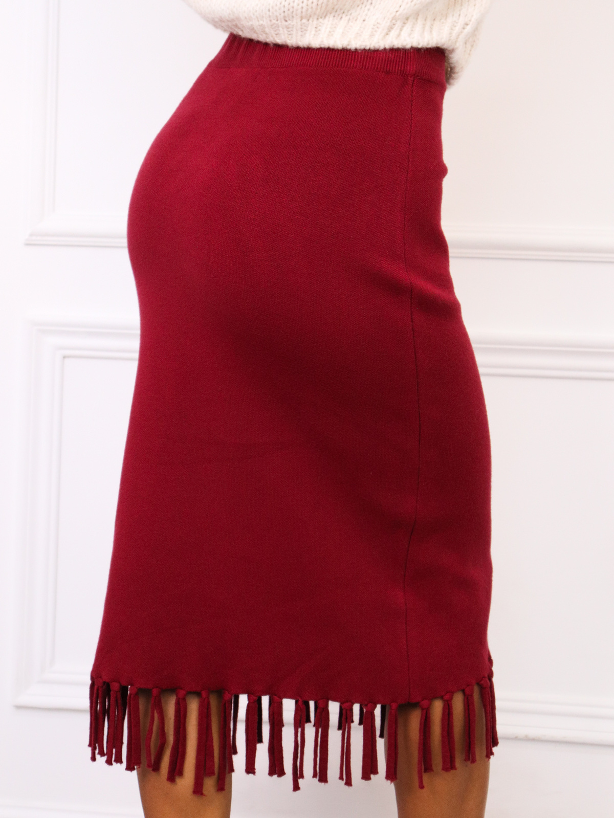 DZIANINOWA SPÓDNICA MIDI ZAKOŃCZONA FRĘDZLAMI-BORDOWA