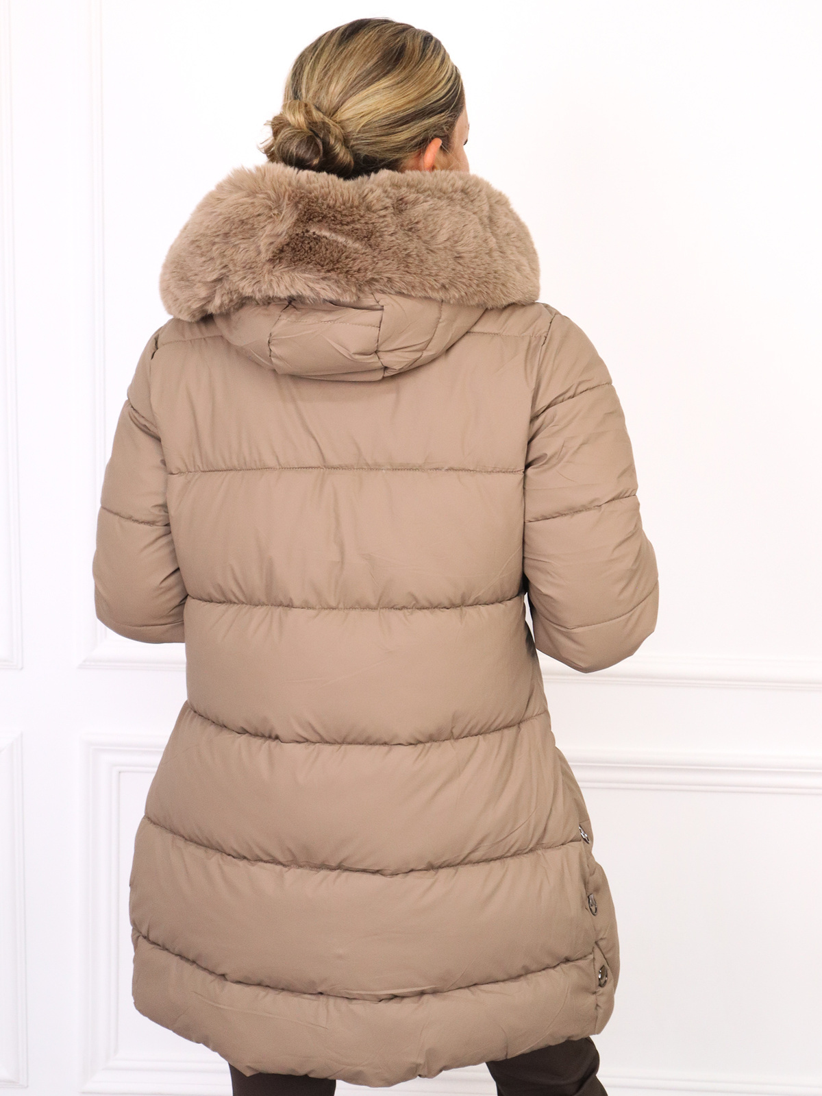 Długa pikowana kurtka, kieszenie zapinane na zamek, po bokach ozdobne elementy. Odpinane futerko przy kapturze.