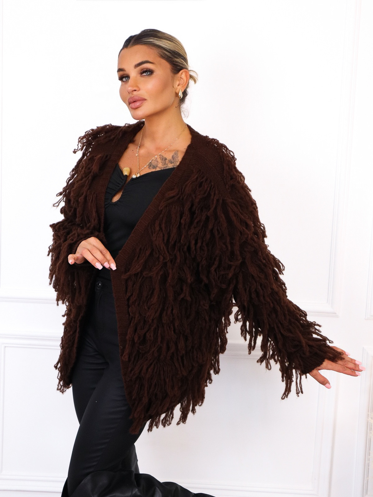 KARDIGAN DZIANINOWY Z FRĘDZLAMI- CZEKOLADOWY
