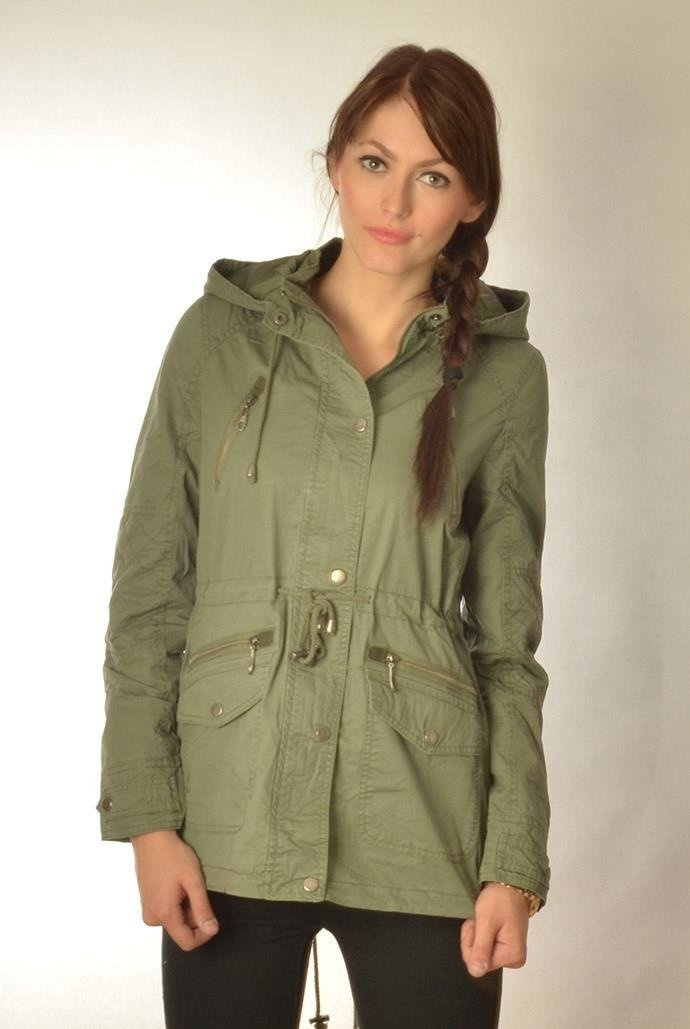 ZIELONA KURTKA MATERIAŁOWA ZAPINANA NA ZAMEK I ZATRZASKI, KAPTUR NA ZAMEK, WIĄZANA W PASIE